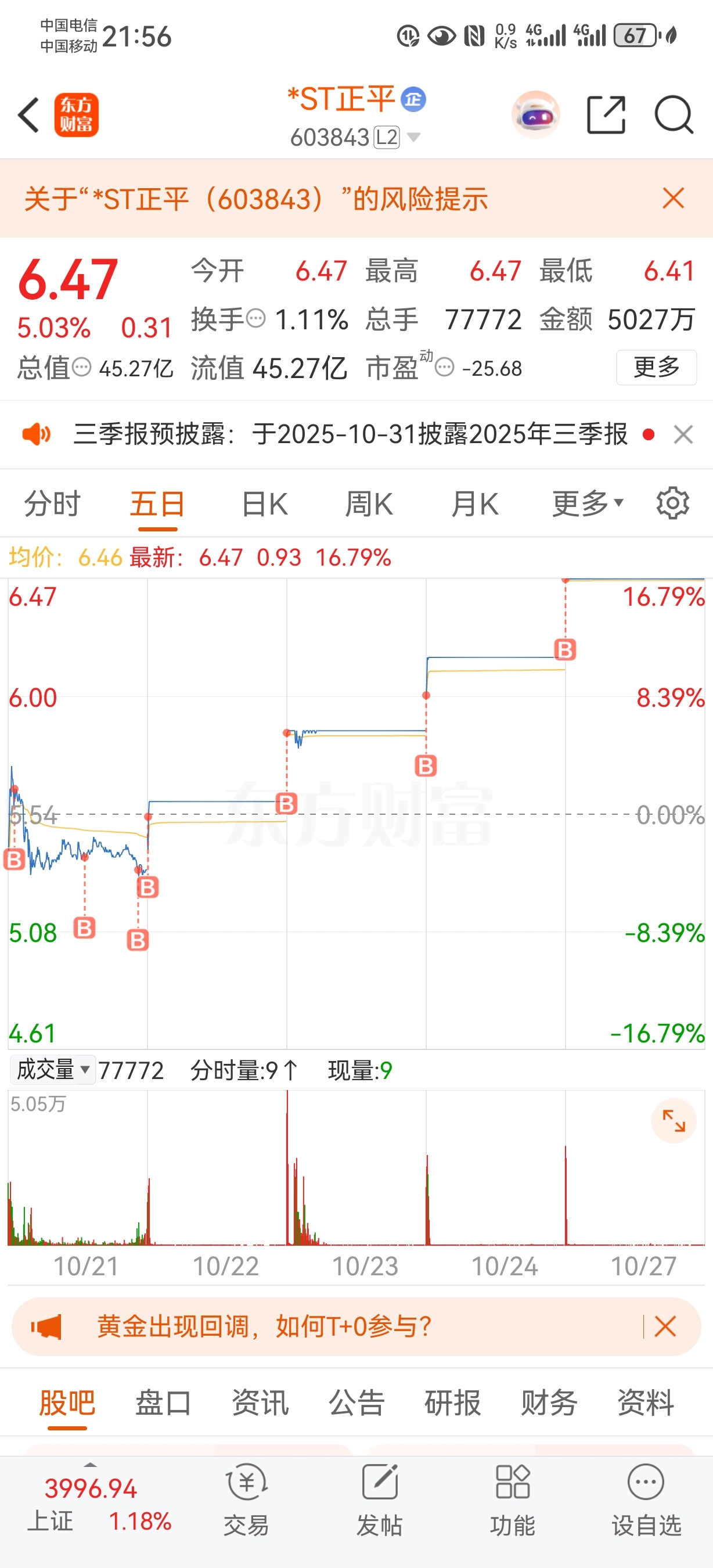 $*ST正平(SH603843)$ 明天还给机会不?