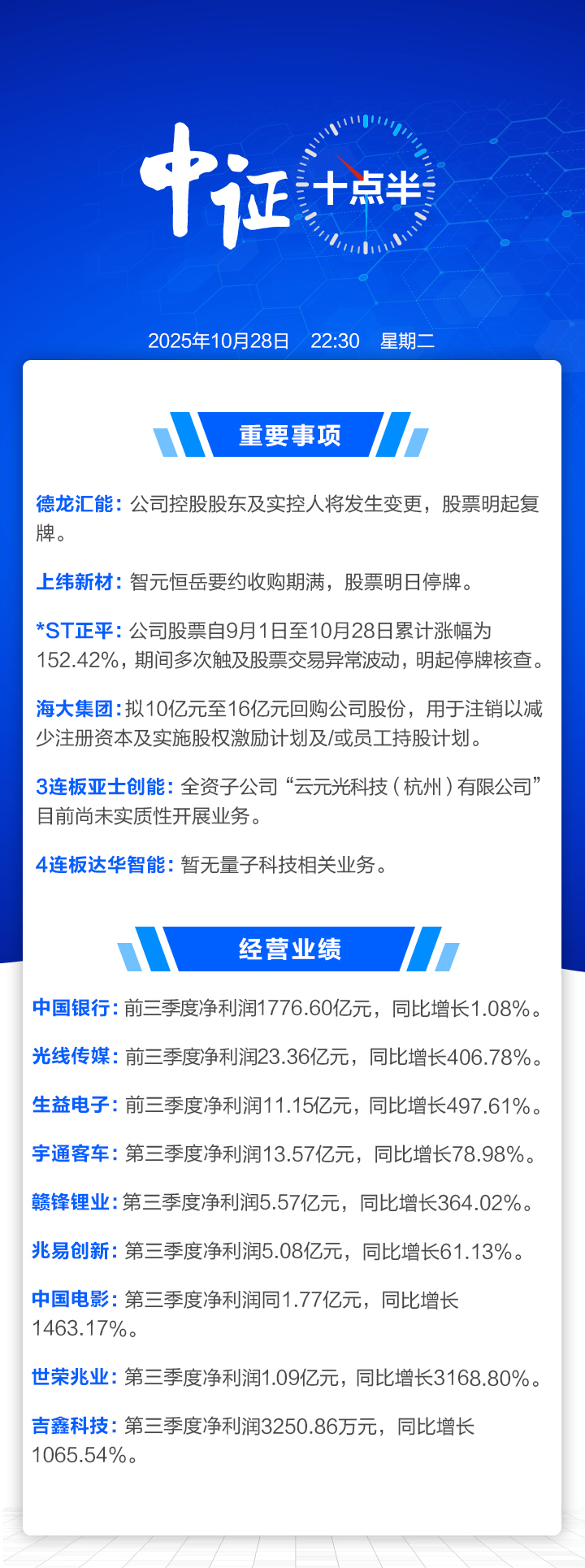 【中证十点半】大涨152% *ST正平明起停牌核查;生益电子前三季度净利润同比增长498%