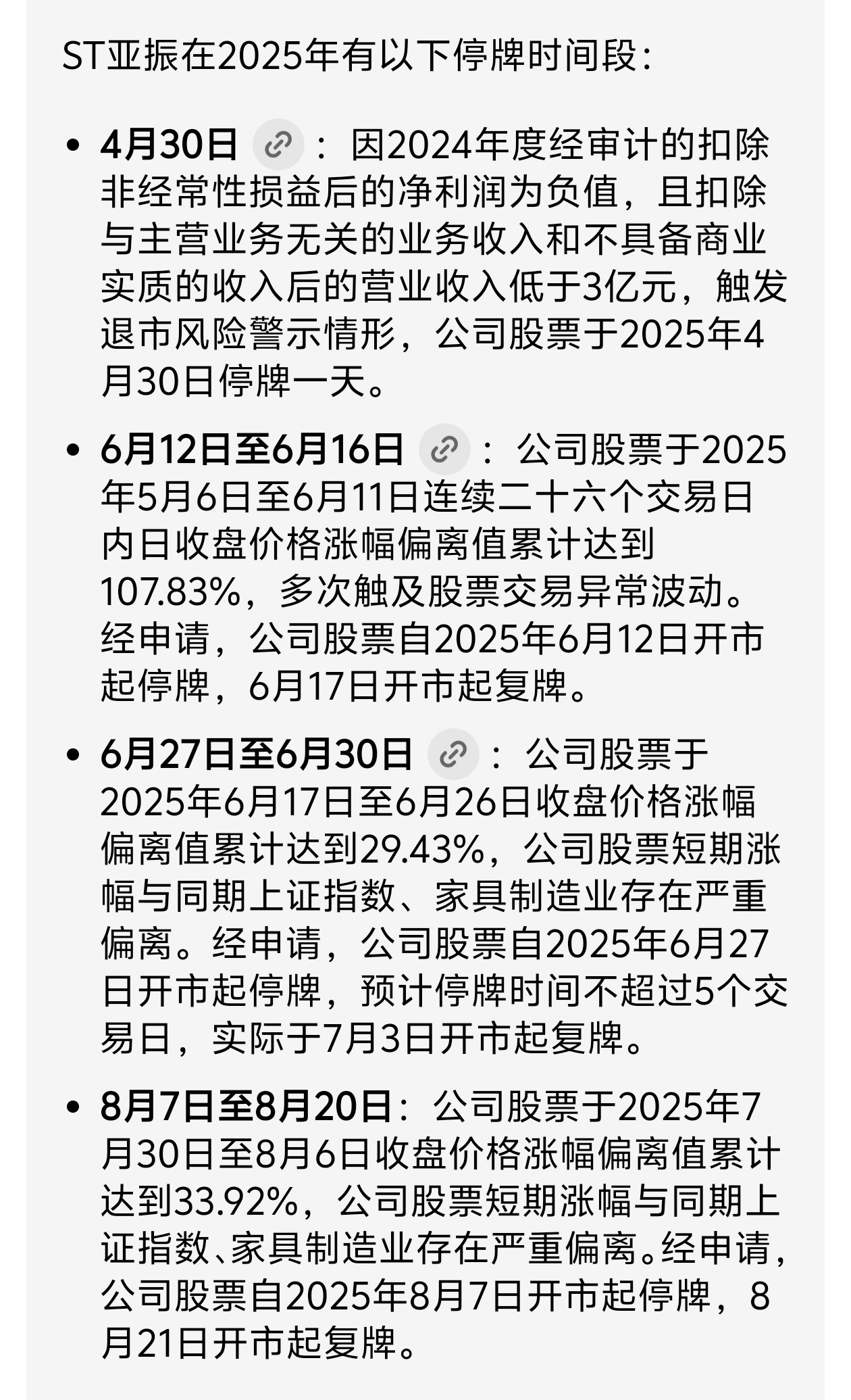 同为st股票,且同属在上海证券交易所上市的股票,st亚振第一次停牌三天,第二次停