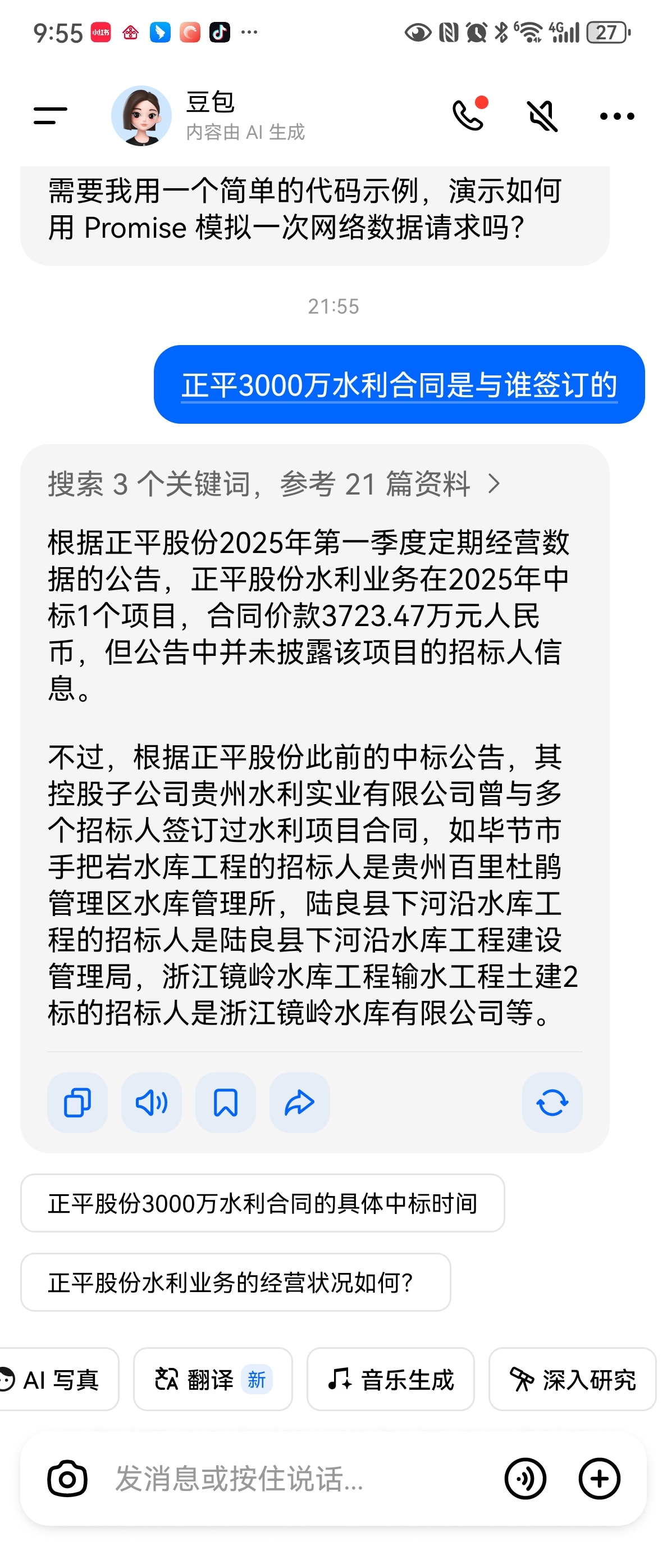 $*ST正平(SH603843)$ 水利合同,请看豆包回答