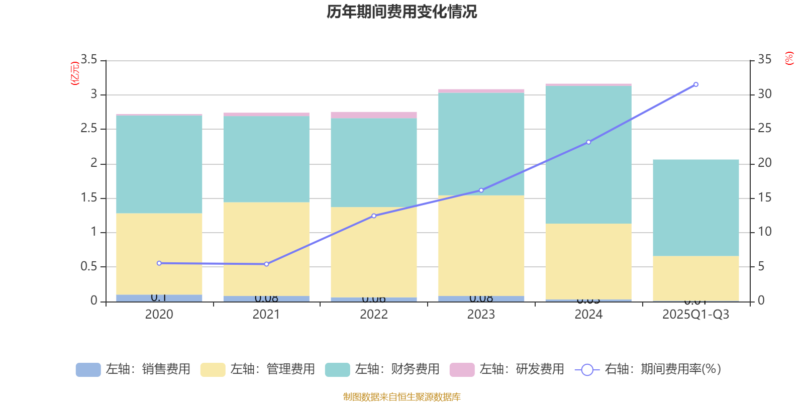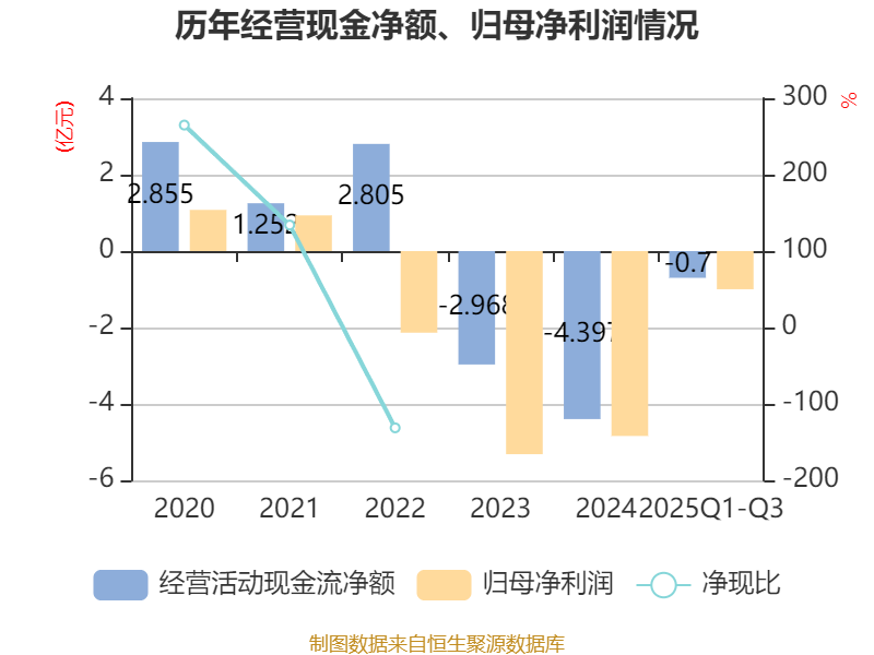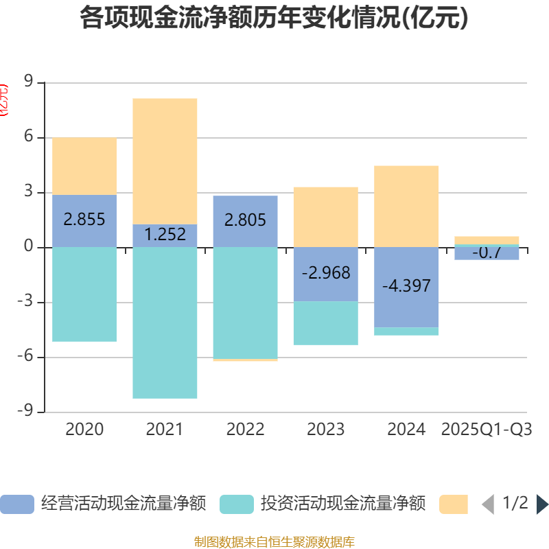 2025年前三季度,公司经营活动现金流净额为-6996.4万元,同比增加1777.32万元;筹资活动现金流净额4341.54万元,同比减少7867.74万元;投资活动现金流净额1479.66万元,上年同期为3034.92万元。