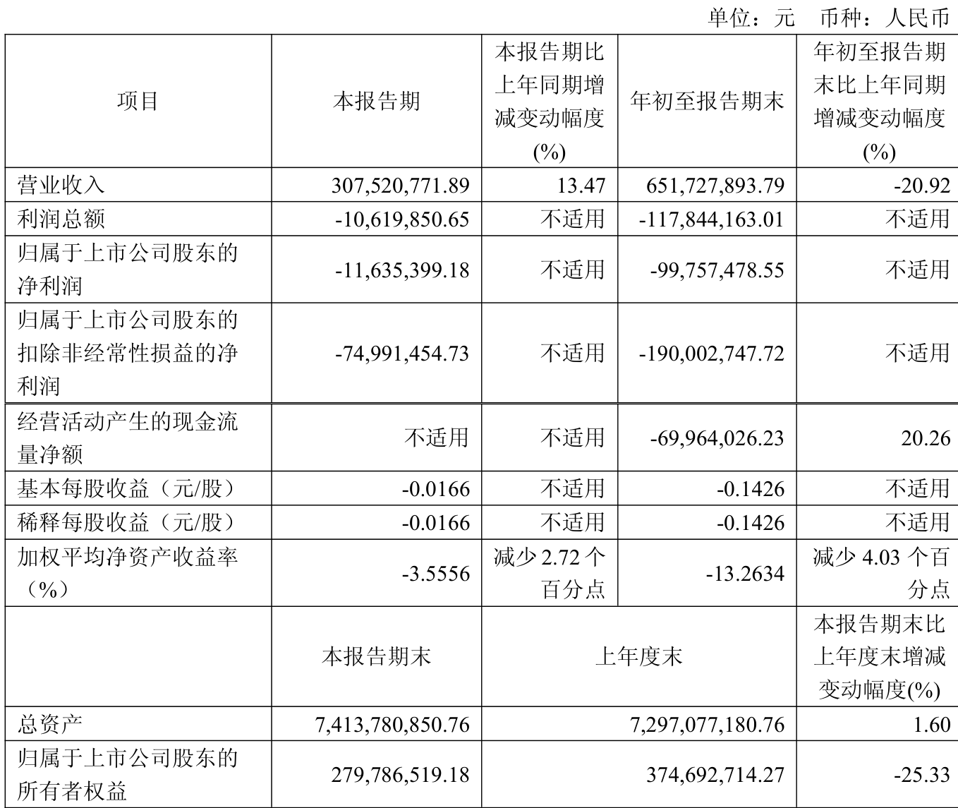 中证智能财讯 *ST正平(603843)10月31日披露2025年第三季度报告。前三季度公司实现营业总收入6.52亿元,同比下降20.92%;归母净利润亏损9975.75万元,上年同期亏损8599.97万元;扣非净利润亏损1.9亿元,上年同期亏损8320.07万元;经营活动产生的现金流量净额为-6996.4万元,上年同期为-8773.72万元;报告期内,*ST正平基本每股收益为-0.1426元,加权平均净资产收益率为-13.26%。