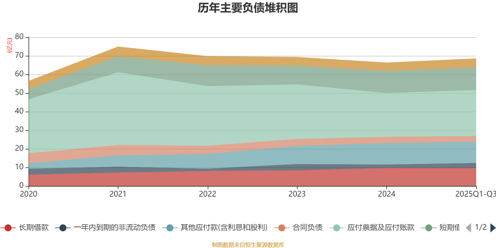 负债重大变化方面,截至2025年三季度末,公司应付票据及应付账款较上年末增加5.61%,占公司总资产比重上升1.27个百分点;一年内到期的非流动负债较上年末增加51.43%,占公司总资产比重上升1.22个百分点;合同负债较上年末减少14.81%,占公司总资产比重下降0.77个百分点;长期借款较上年末减少1.1%,占公司总资产比重下降0.35个百分点。