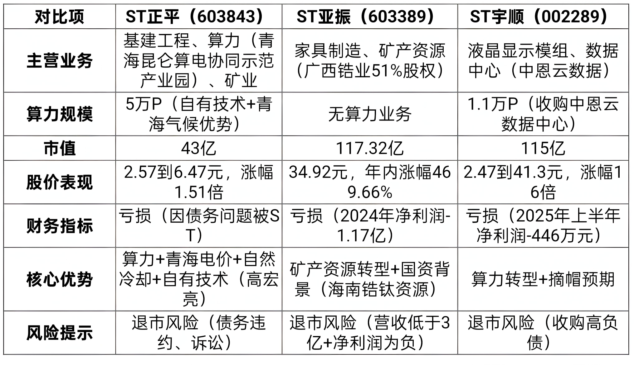 $*ST正平(SH603843)$ $*ST亚振(SH603389)$ $*ST宇顺(SZ002289)$ 对比数据收集于网络,不构成参考意见: