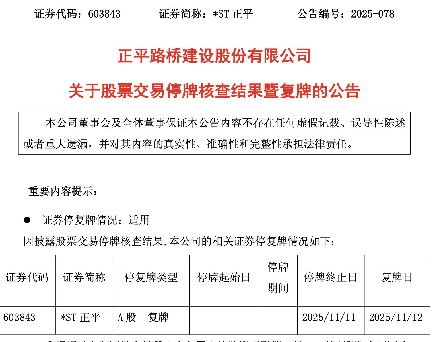 11月11日晚,*ST正平(603843.SH)公告称,近日,公司就股票交易情况进行核查,鉴于相关核查工作已完成,经申请,公司股票将于11月12日开市起复牌。经自查,公司目前生产经营情况正常,未发生重大变化,未发现其他可能对公司股价产生较大影响的重大事件;不存在应披露而未披露的重大信息。