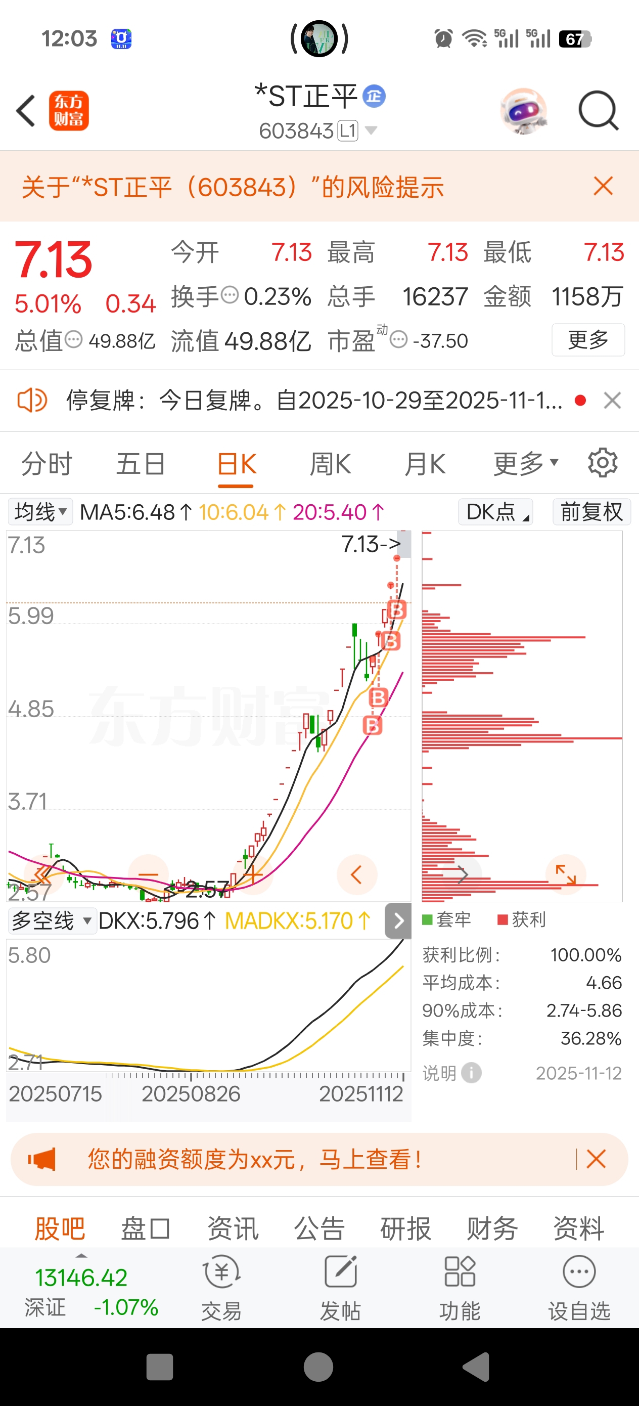 $*ST正平(SH603843)$ 现在看来连着4天加仓没错,停牌前最后一天也加了,可惜的是今天堵门加不了了