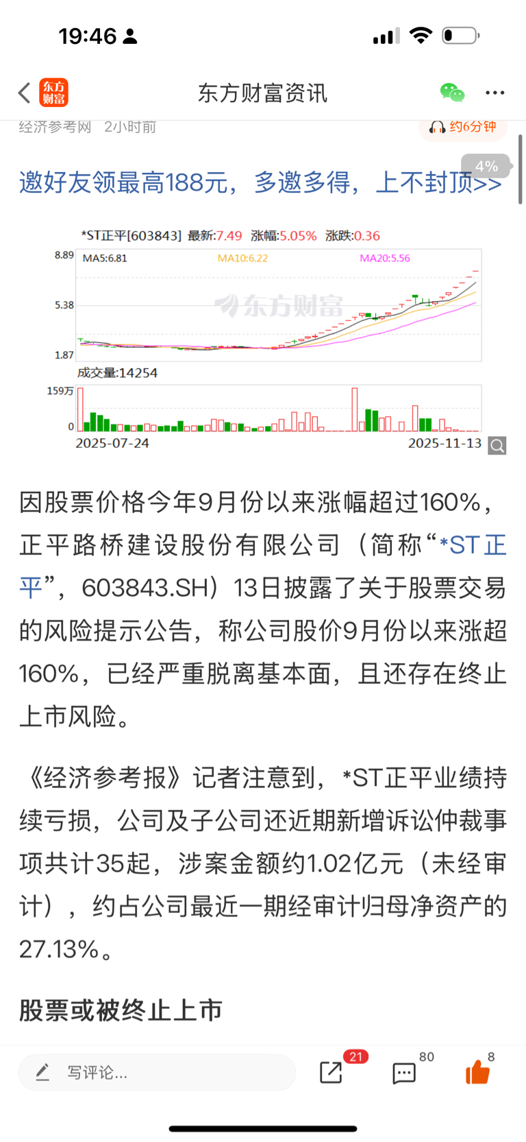 $*ST正平(SH603843)$ 正平有点像当初的泛海!也是出了退市风险之后就一直跌,万方前段时间出了一个退市风险之后也一直跌。正平像极了泛海$*ST泛海(SZ000046)$ $*ST万方(SZ000638)$