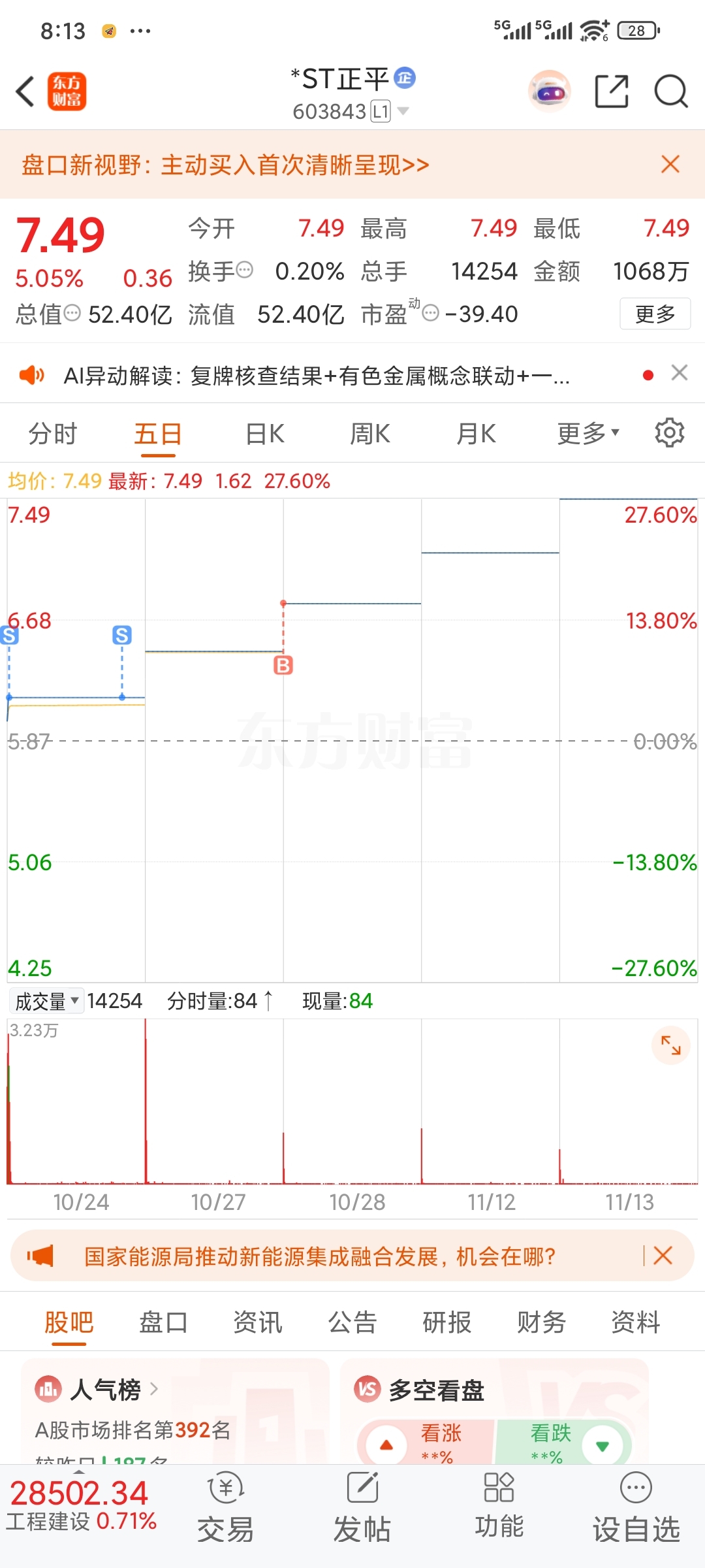 $*ST正平(SH603843)$ 当初也是被洗跑了,幸亏停牌前又挤进来了,这次不会轻易下车了