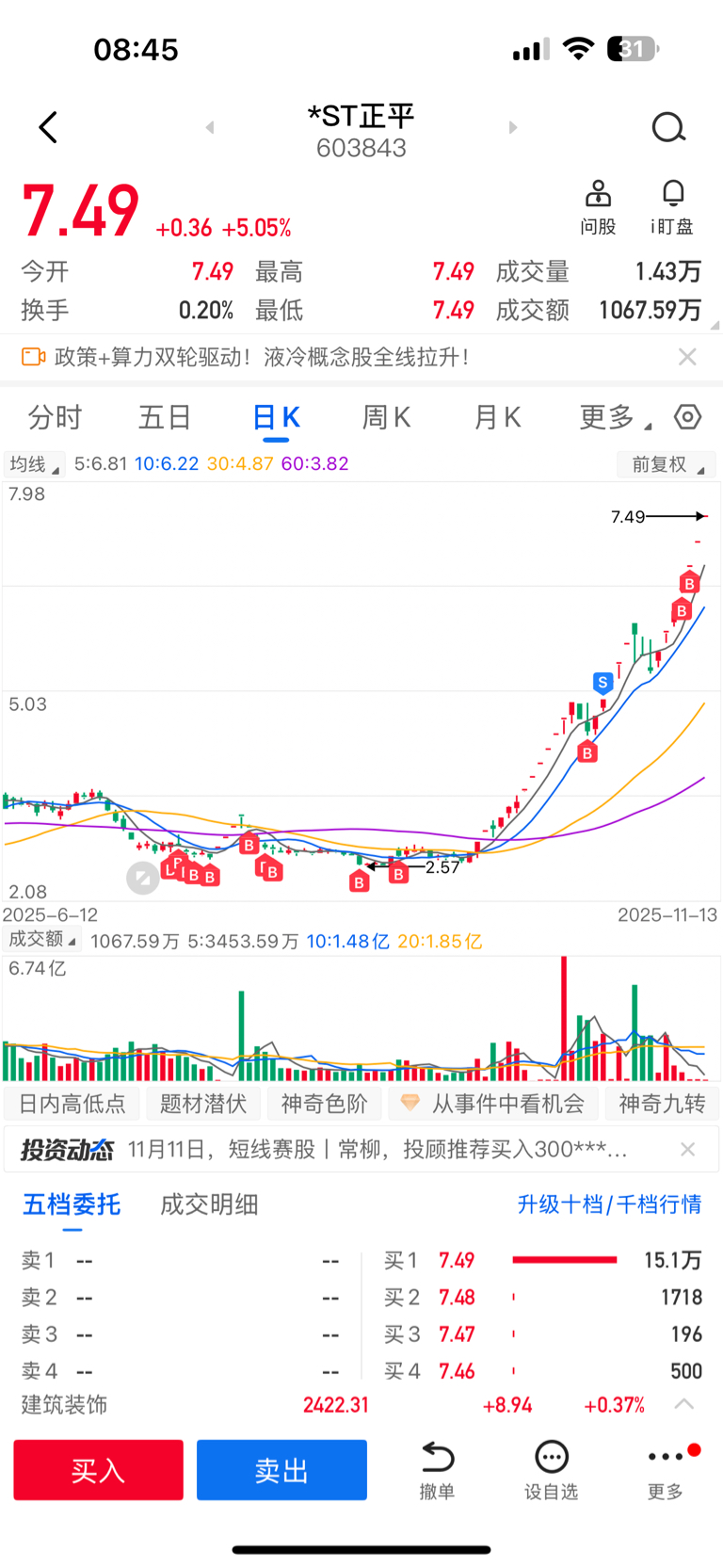 $*ST正平(SH603843)$ 继续顶,如果能把SP掉就完美了,s是买掉前面两个加仓点,整体其他没动,后面进小黑屋钱顶了两天进去了点
