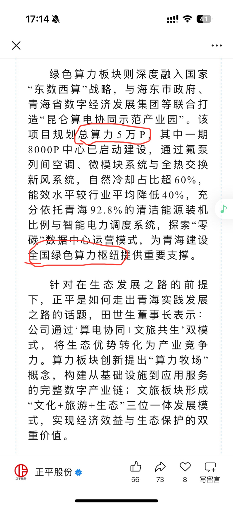 过去的正平是路桥公司,买现在的正平相当于是“算力+矿山新公司上市前的原始股”,10元钱买到价值1600亿以上的新上市公司的原始股,你我都要感恩正平、感恩青海。谁能想到,你我小小散户,10元钱就能买到(算力+矿山)上市前的原始股呢?但凡买到的都是幸运儿。