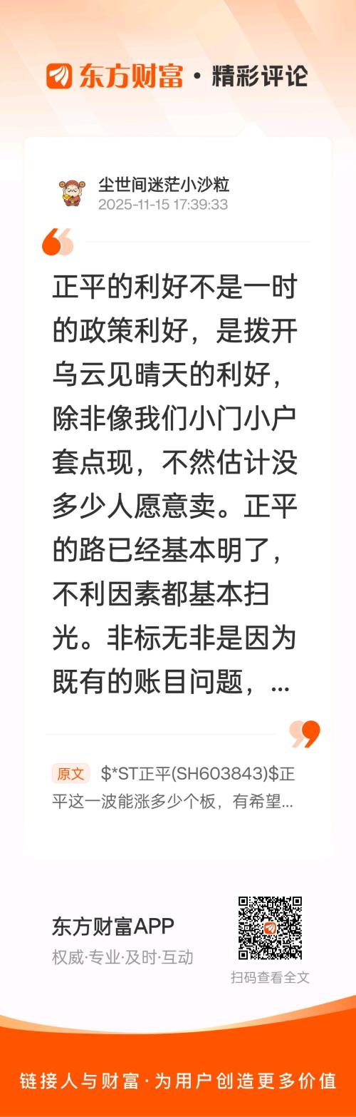 //@尘世间迷茫小沙粒 :正平的利好不是一时的政策利好,是拨开乌云见晴天的利好,除非像我们小门小户套点现,不然估计没多少人愿意卖。正平的路已经基本明了,不利因素都基本扫光。非标无非是因为既有的账目问题,清完账了,也就不用担心。还有开采问题,有权证,还把资金占用也解决了,就是合法合规,就是属于我找谁借钱,就是我找他一起赚钱的节奏,估计不会找不到。