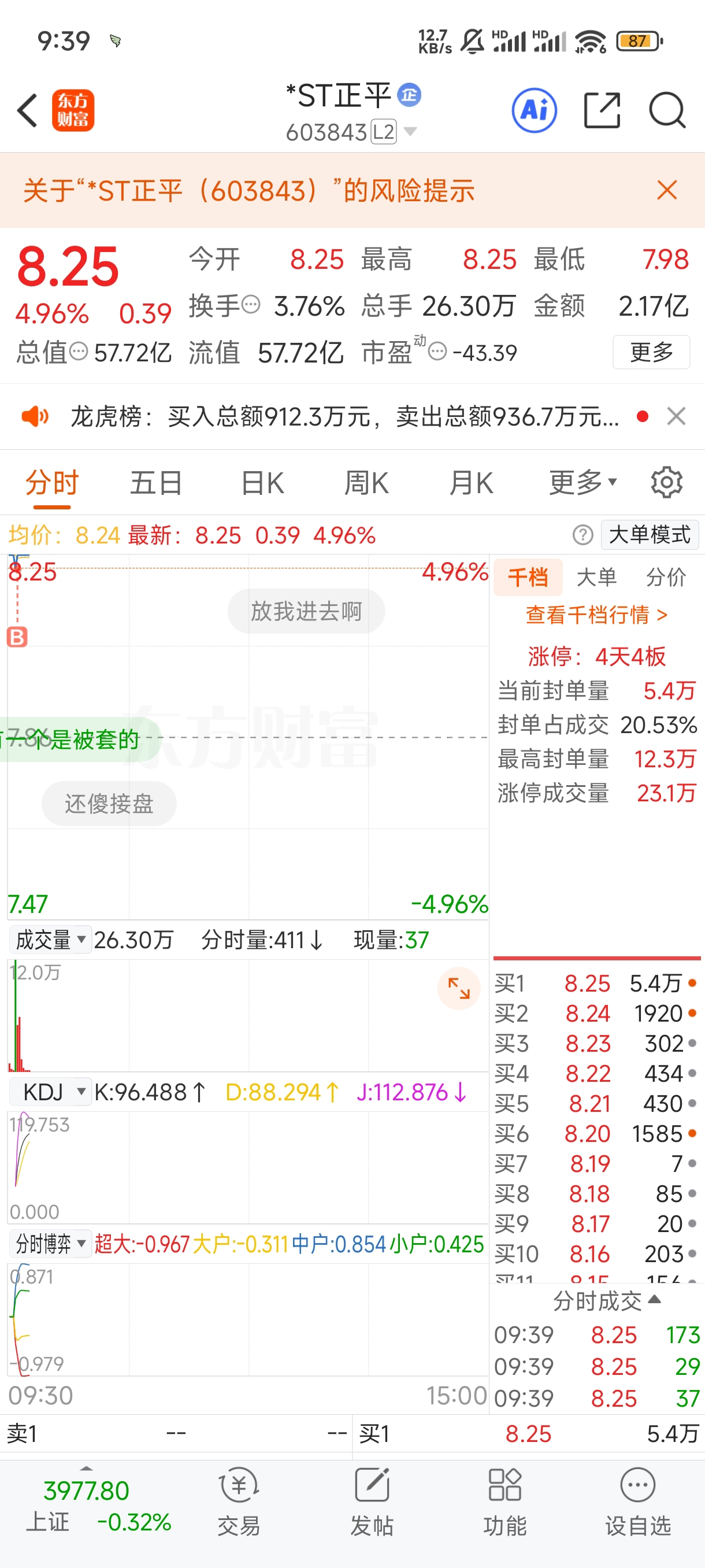 $*ST正平(SH603843)$ 东财仓位空了半个星期,终于进来了
