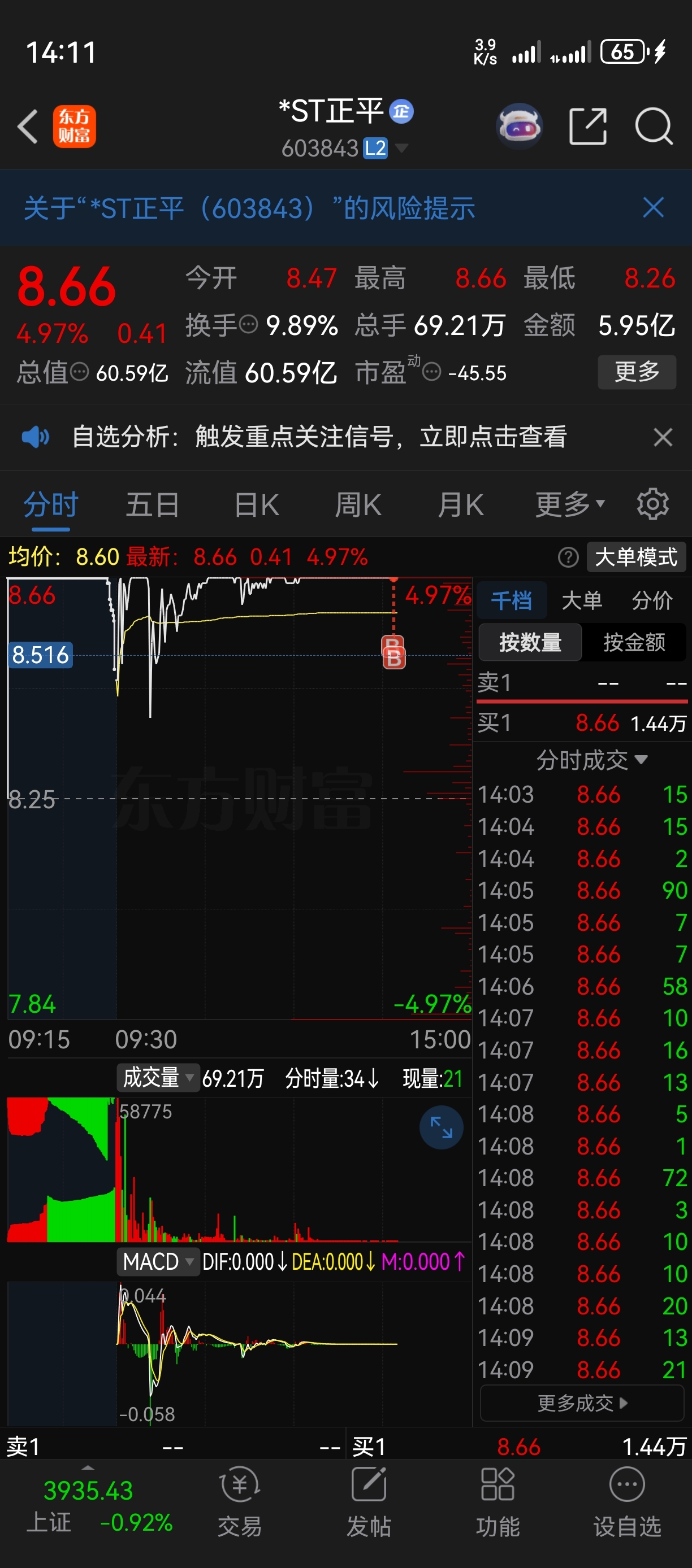 $*ST正平(SH603843)$ 排单中迪进不去。没及时撤单。错过了正平加仓点。悔啊,排队进去了尾盘千万别炸
