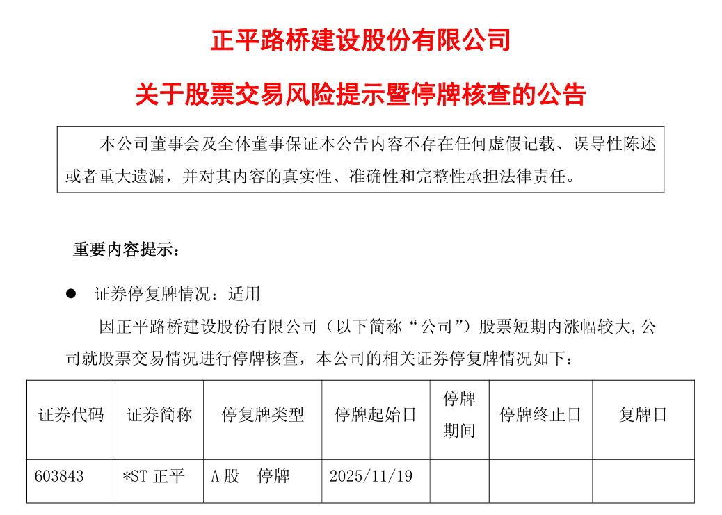 11月18日晚间,*ST正平(603843,股价8.66元,市值60.59亿元)公告称,公司股票自2025年9月1日至11月18日累计涨幅达221.93%,股价短期涨幅与同期上证指数、建筑行业存在严重偏离,已严重脱离基本面。