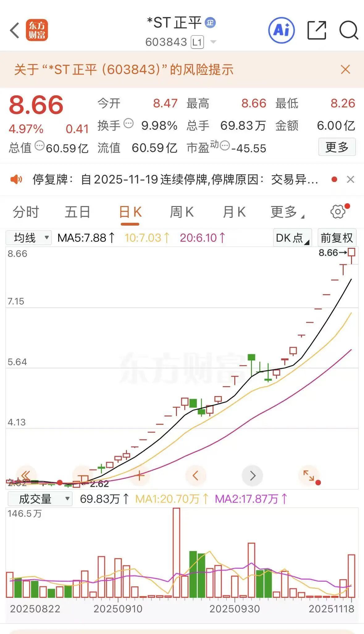 自11月12日复牌起,5个交易日内,*ST正平已连收5个涨停板。