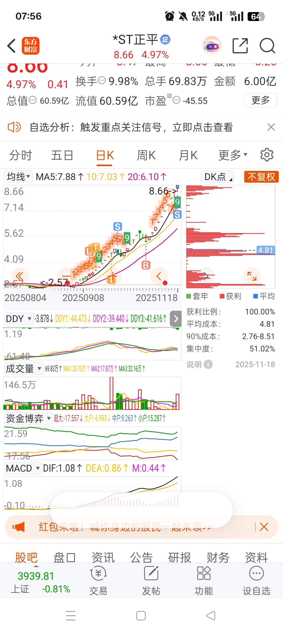 $*ST正平(SH603843)$ 感谢正平让我赚到了钱,感谢庄家昨天已经减仓到2万多一点了,后面随便怎么走,希望后面继续大涨让昨天进的也大赚啊,唯一不好的是停牌时间有点久