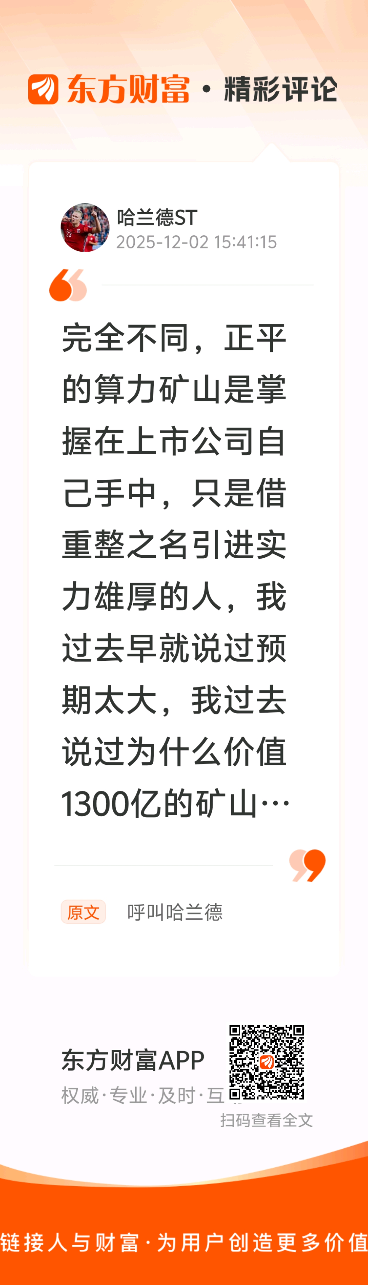 这下低于70真的是在唱空了//@哈兰德ST :完全不同,正平的算力矿山是掌握在上市公司自己手中,只是借重整之名引进实力雄厚的人,我过去早就说过预期太大,我过去说过为什么价值1300亿的矿山给了正平?过去我没有点破,现在你应该知道答案了。