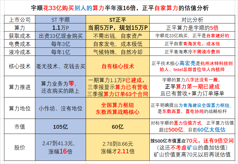 $*ST正平(SH603843)$ 人气排名65了(截图1),今天如果低于50万手封涨停、每个st人都有责任!单说算力估值就超过500亿,看截图2,从9个维度对比转型算力的st宇顺:每个维度正平都远远比宇顺强,宇顺半年涨16板,正平涨32倍只是起点而已。