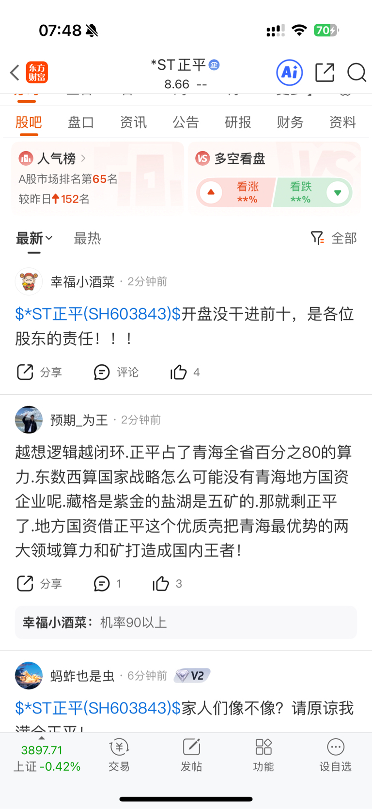 人气排名65了(截图1),今天如果低于50万手封涨停、每个st人都有责任!单说算