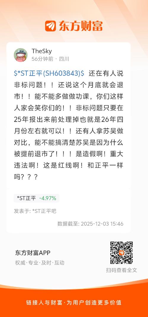$*ST正平(SH603843)$ 还在有人说非标问题!!还说这个月底就会退市!!能不能多做做功课,你们这样人家会笑你们的!!非标问题只要在25年报出来前处理掉也就是26年四月份左右就可以!!还有人拿苏吴做对比,能不能搞清楚苏吴是因为什么被提前退市了!!!是造假啊!重大违法啊!这是红线啊!和正平一样吗???