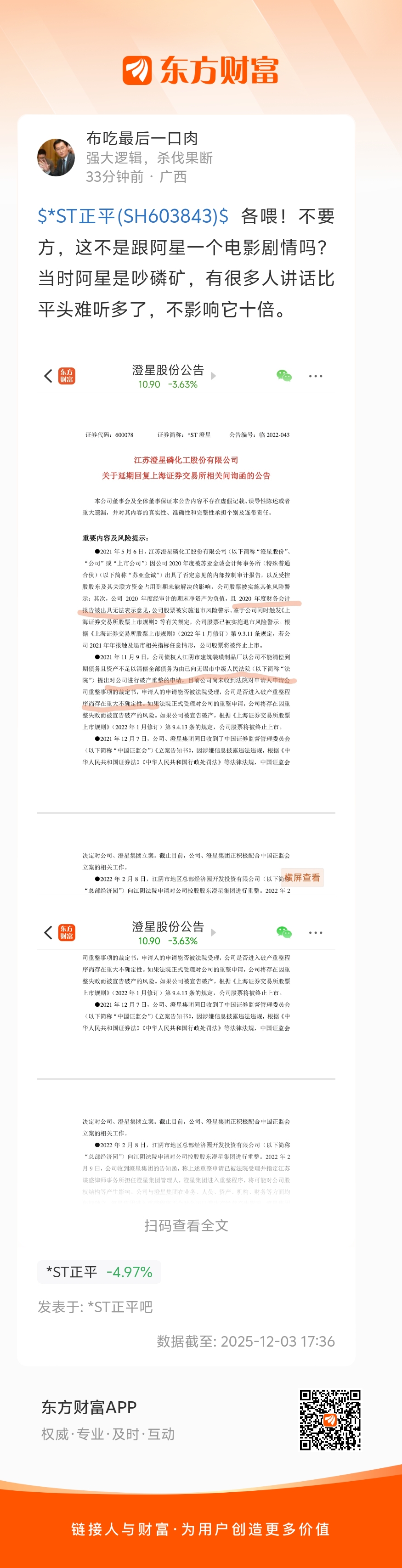 $*ST正平(SH603843)$  各喂!不要方,这不是跟阿星一个电影剧情吗?当时阿星是吵磷矿,有很多人讲话比平头难听多了,不影响它十倍。