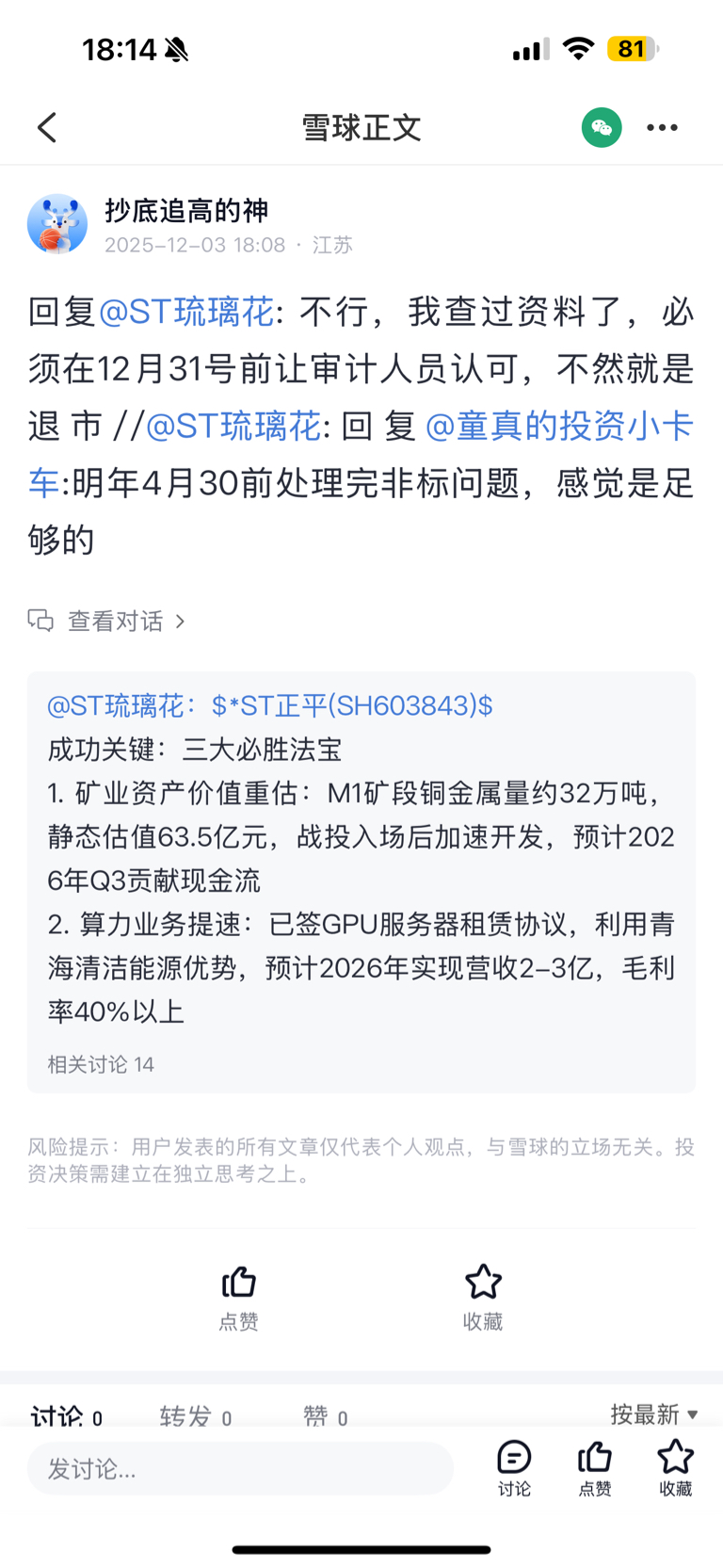 $*ST正平(SH603843)$ 不要听他们唱多,雪球很多大佬都分析清楚了,这个月不解决直接退市,每天挂隔夜单,早一点出来钱少亏点,上班赚钱不容易,别被人忽悠