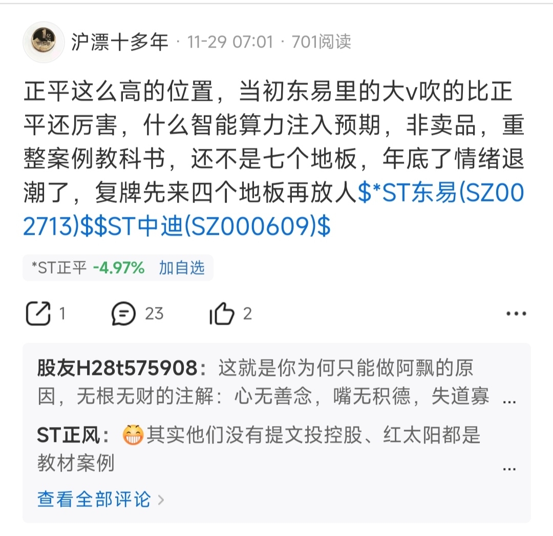 $*ST正平(SH603843)$ 正平里的人29号看了我的帖子的,聪明的左右挂隔夜单都能跑出来,喷我的,还有看了昨晚大v发帖要顶板错失良机的,还有4个地板跑出来算你幸运$ST中迪(SZ000609)$ $*ST东易(SZ002713)$
