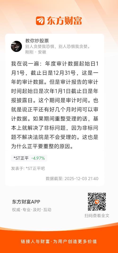 我在说一遍:年度审计数据起始日1月1号,截止日是12月31号,这是一年的审计数据。但是审计报告的审计时间起始日是次年1月1日截止日是年报披露日。这个期间是审计时间。也就是说正平还有好几个月时间可以审计数据。如果期间重整受理的话,基本上就解决了非标问题,因为非标问题不解决法院是不会受理的。这也是为什么正平要重整的原因。