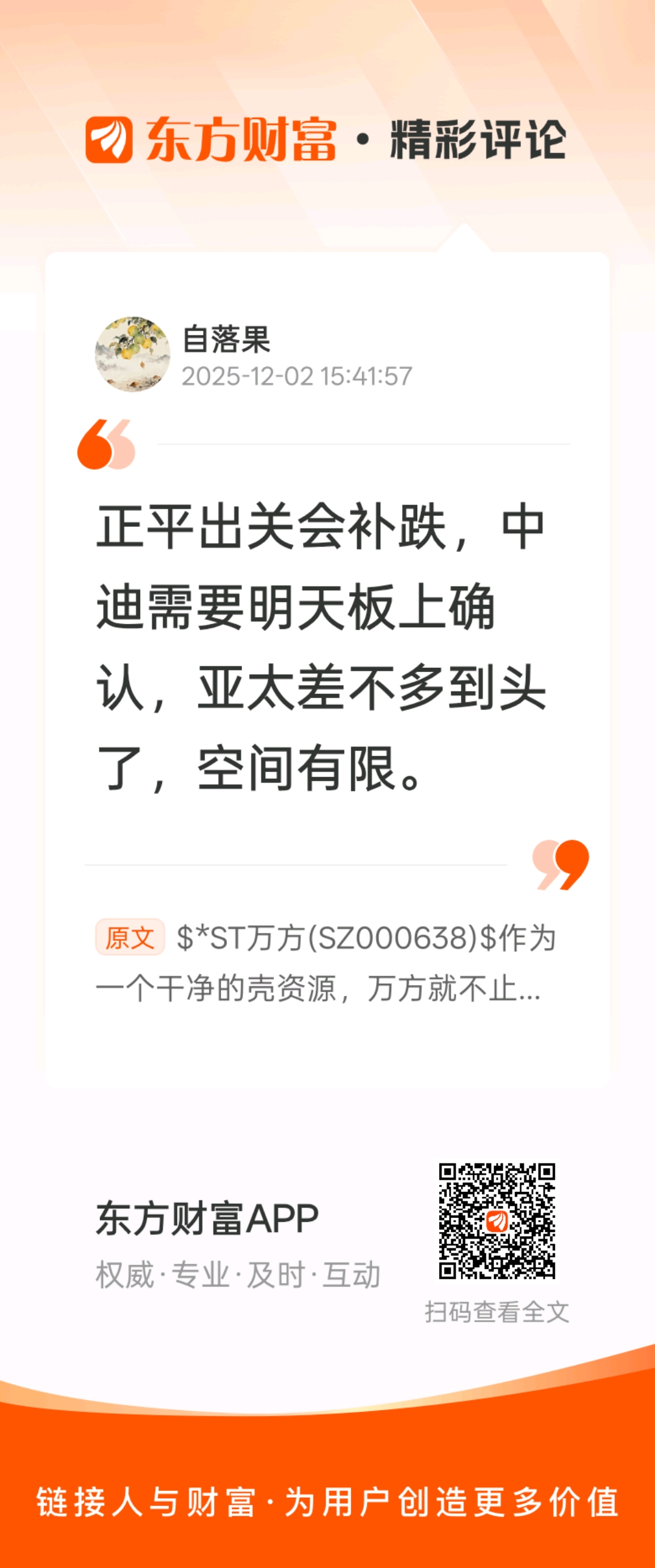 $*ST万方(SZ000638)$ 作为一个干净的壳资源,万方就不止这个价,何况还有一个好爸爸。等调查落地,过户完成,股价至少会摸前高,甚至翻倍。现在无非是花点时间等待