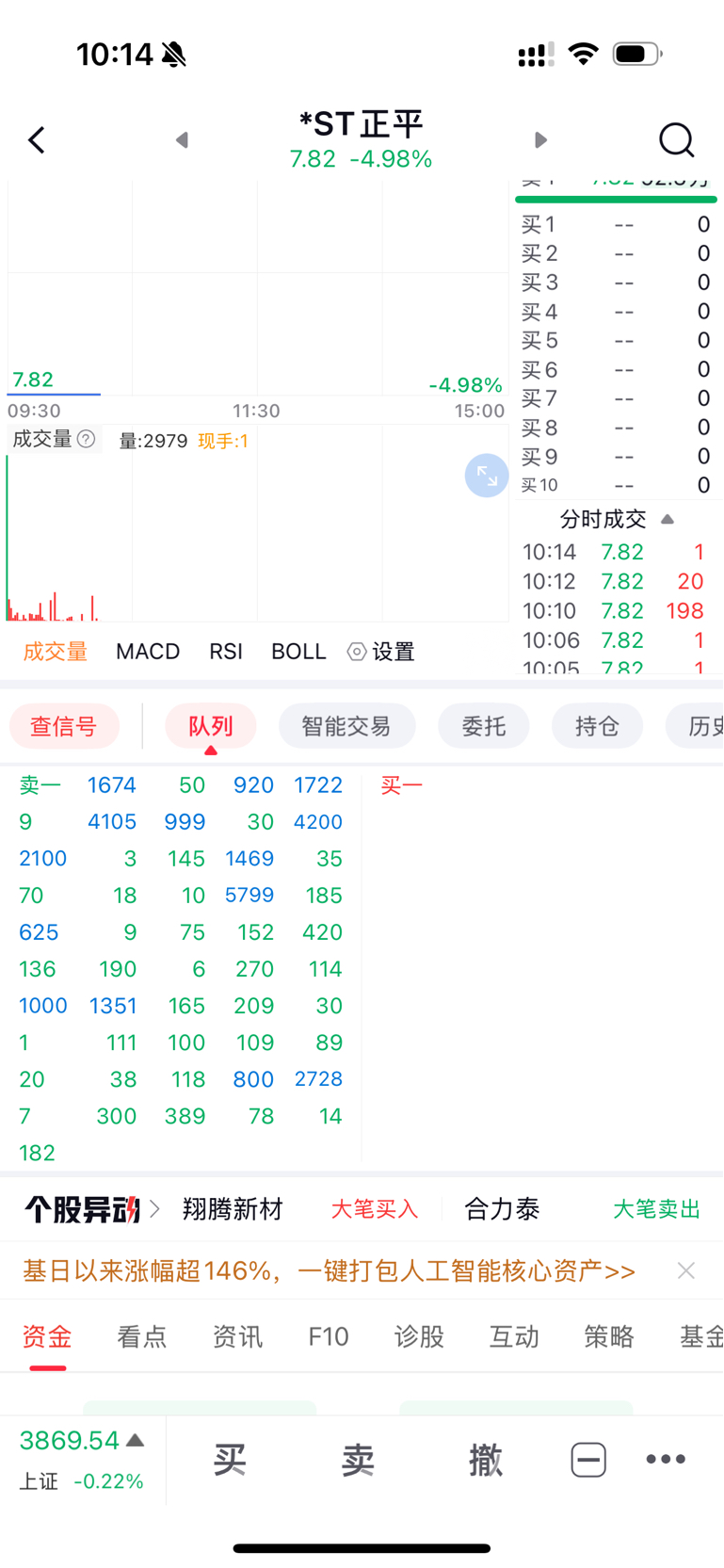 $*ST正平(SH603843)$ 前面没你的,可以撤单了,挂着也出不去