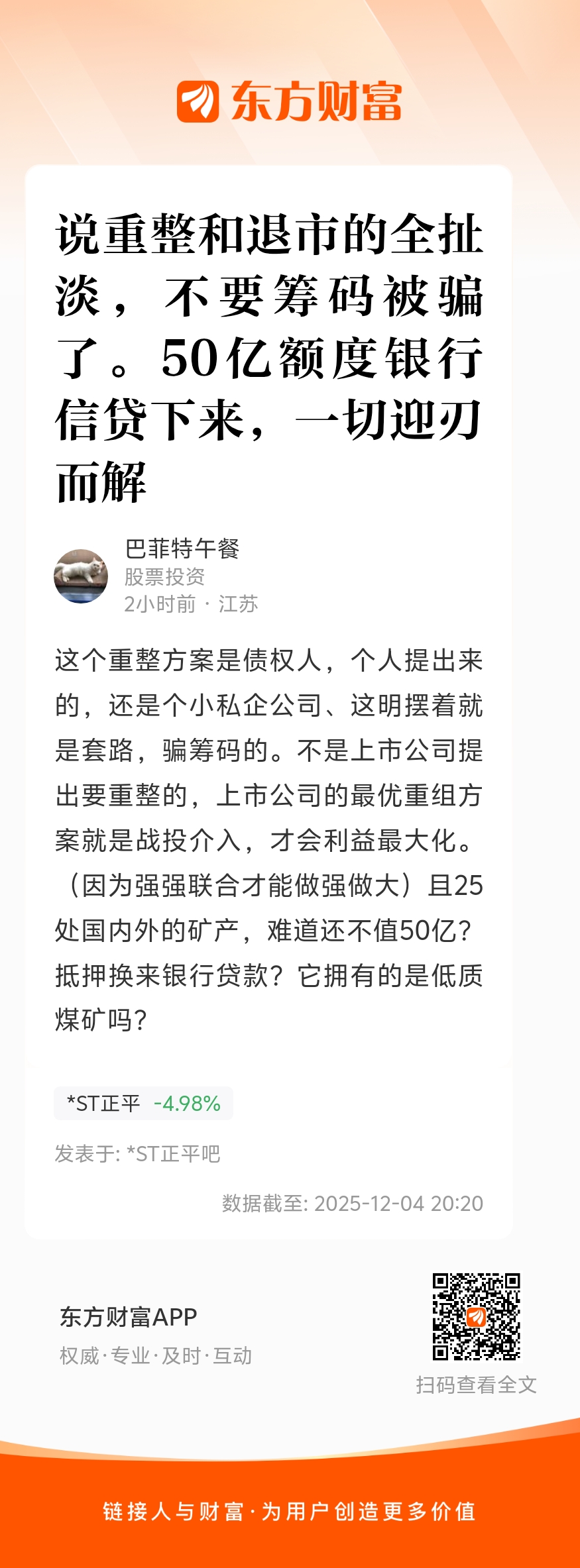这个重整方案是债权人,个人提出来的,还是个小私企公司、这明摆着就是套路,骗筹码的。不是上市公司提出要重整的,上市公司的最优重组方案就是战投介入,才会利益最大化。(因为强强联合才能做强做大)且25处国内外的矿产,难道还不值50亿?抵押换来银行贷款?它拥有的是低质煤矿吗?