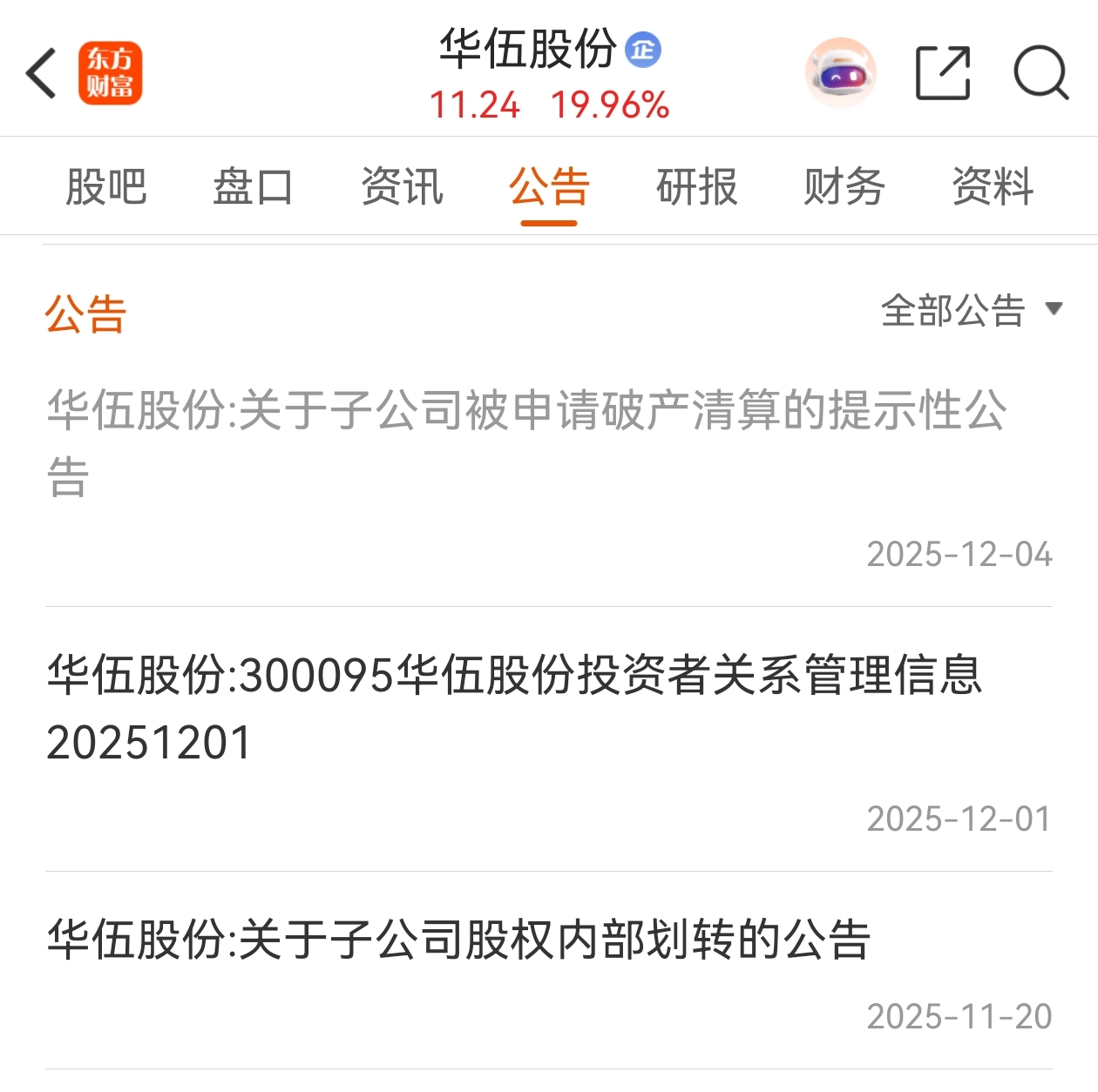 $*ST正平(SH603843)$ 华伍股份昨天发破产重整提示性公告,直接20厘米涨停,筹码被一口闷了,换手率32%,我们东财股吧这么团结,千万别把筹码被主力在底部给一口闷了,卖不出着急被闷了买不进又着急!要以不动应万变,我随时计划再加仓,正平本周末大概率就要出重整的提示性公告了,主力闷筹码可能就在这几个交易日了,让主力去闷其他平台的散户,主力急需筹码,不能挡他的发财路!