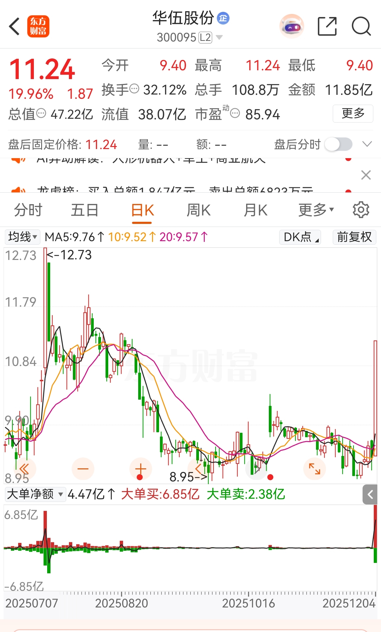 华伍股份昨天发破产重整提示性公告,直接20厘米涨停,筹码被一口闷了,换手率32%
