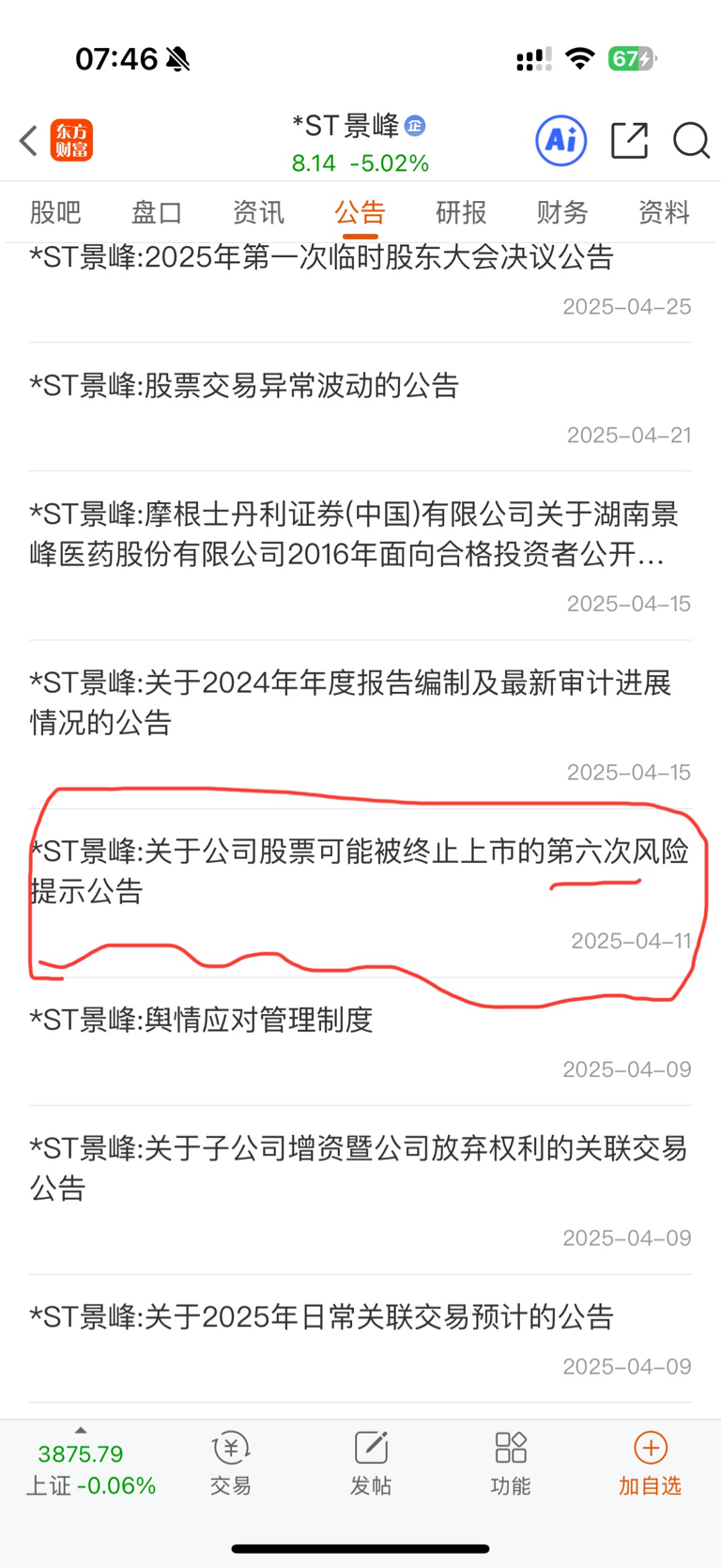有唱退市风险的人,看看景峰连续发退市风险警告到4月11号发了六次(图2),请问人家退市了吗?人家现在不是重整得好好的还获得路条重生了吗?正平到现在为止像景峰那种退市风险警告一次都还没有,担心个啥?完全是有人恶意唱空。