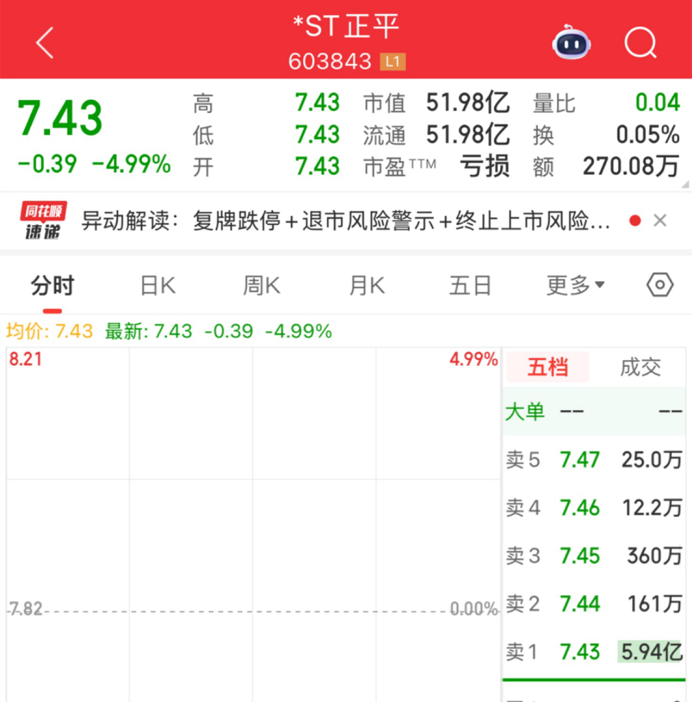 $*ST正平(SH603843)$ 成交额才270万,封单额却高达5.94亿,这么大的封单,说明小散户全挂跌停了吧?真没必要,小心主力一口吃掉。