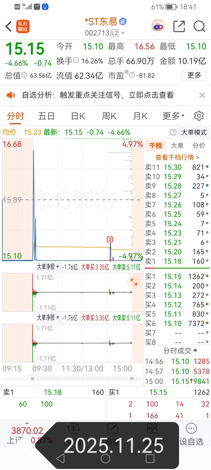 $*ST正平(SH603843)$ $ST远智(SZ002689)$ $*ST东易(SZ002713)$ 东易连续两次开板都是准地天地板,次日一字跌停!经历过了东易十一个地板,正平第一次开板都不敢买了,怕吃地天地板!