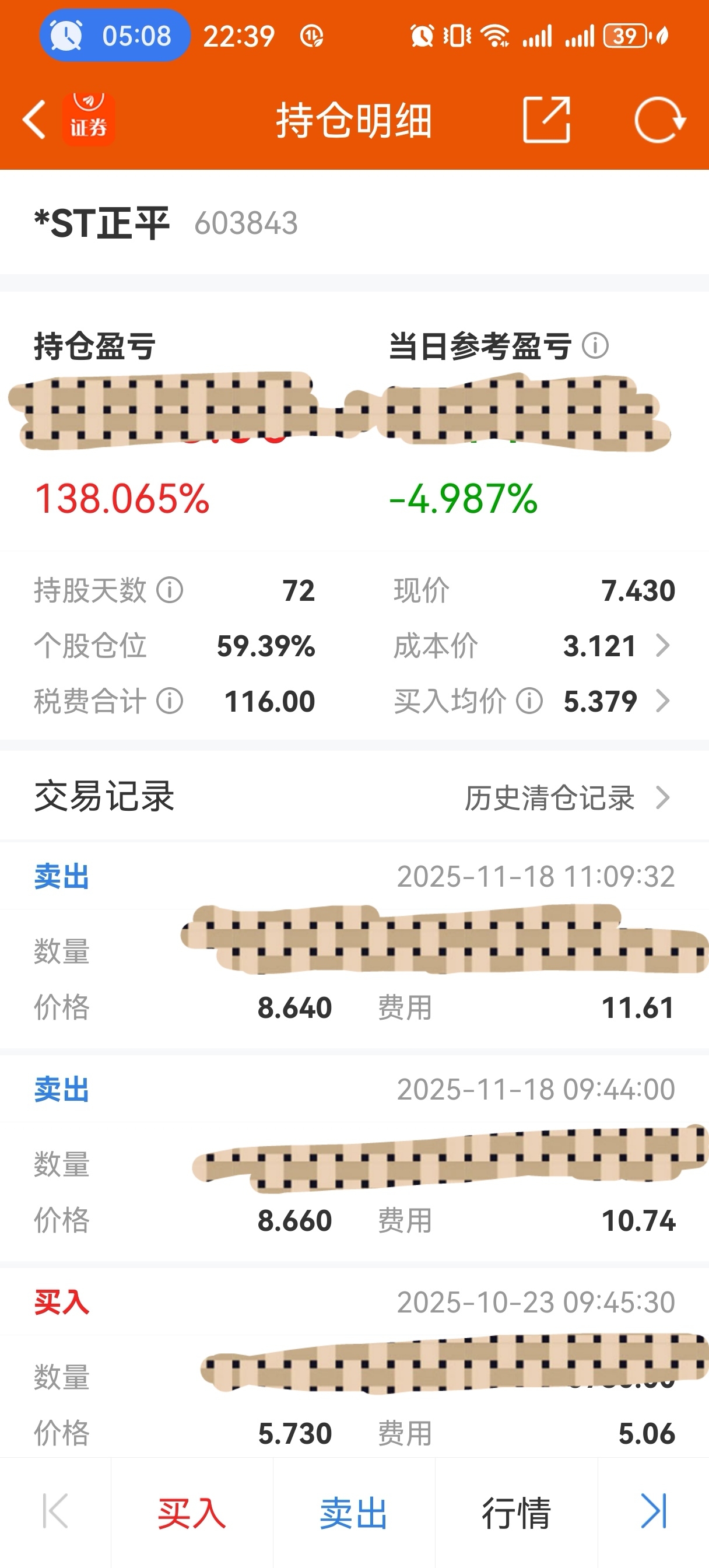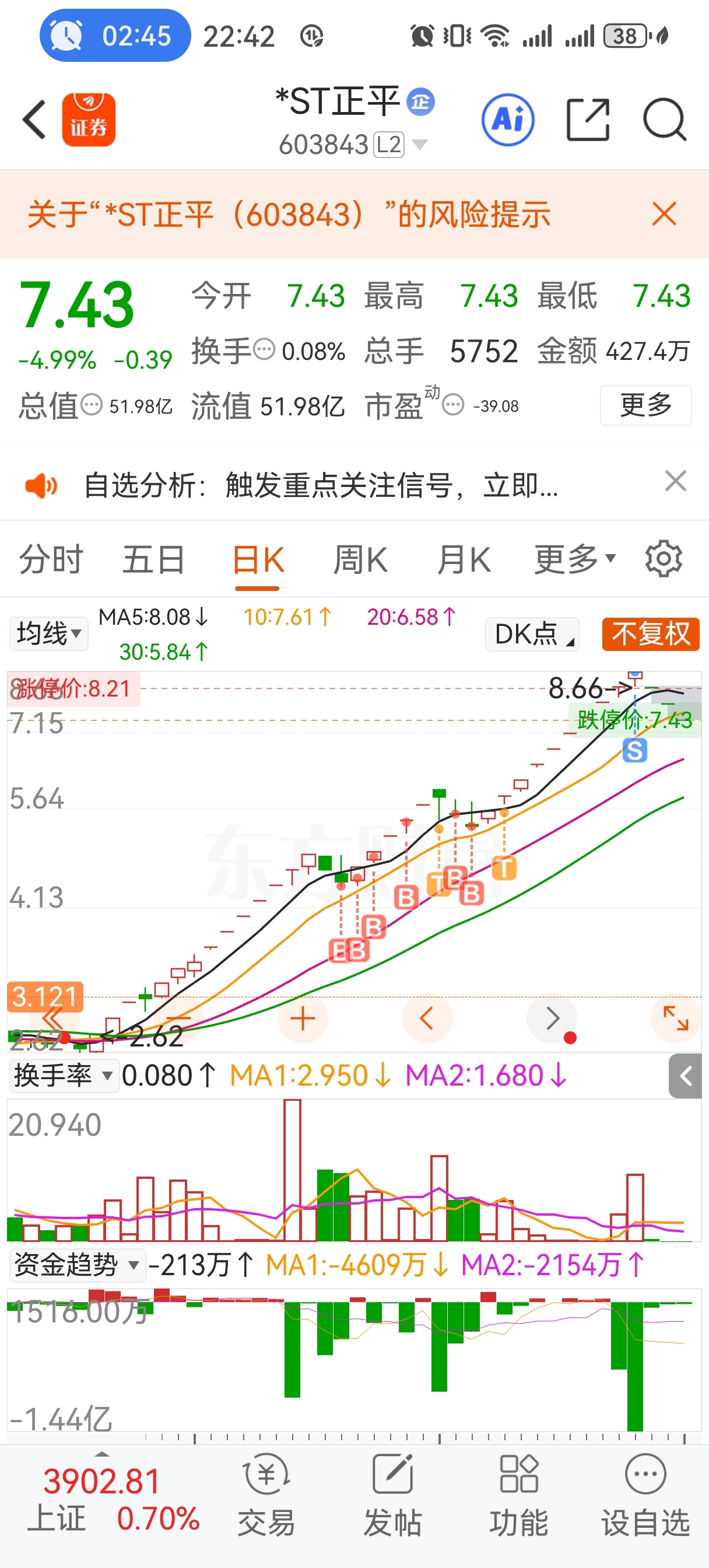 $*ST正平(SH603843)$ 有多少是跟我一样真的没有挂跌停单出逃的?因为挂了也没用,那还不如等待反转的机会加仓。炒ST股很难,要么出不去,要么进不去!所以很难操作,当初都期待到达20块,结果都还没有到10块就顶不住抢跑了