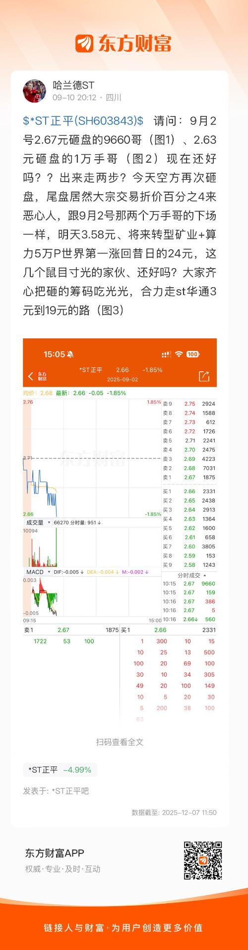 $*ST正平(SH603843)$ 请问:9月2号2.67元砸盘的9660哥(图1)、2.63元砸盘的1万手哥(图2)现在还好吗??出来走两步?今天空方再次砸盘,尾盘居然大宗交易折价百分之4来恶心人,跟9月2号那两个万手哥的下场一样,明天3.58元、将来转型矿业+算力5万P世界第一涨回昔日的24元,这几个鼠目寸光的家伙、还好吗?大家齐心把砸的筹码吃光光,合力走st华通3元到19元的路(图3)