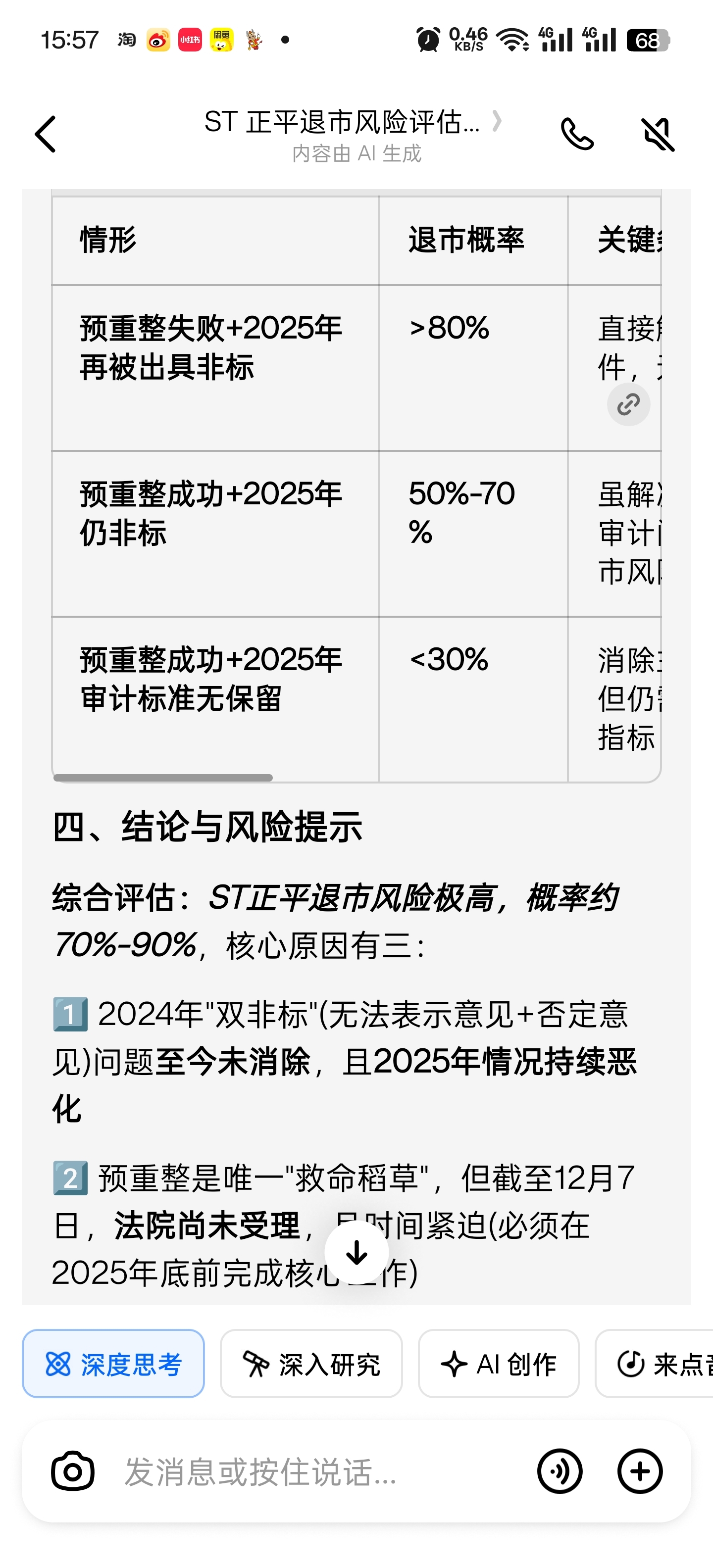 $*ST正平(SH603843)$ 善意提醒一下场外的小散,还是别参与抄底翘板子了,年底了,风险很大,那么多好票,没必要博弈一个有退市风险的股。买这个票的风险远大于买主板龙头航天发展。