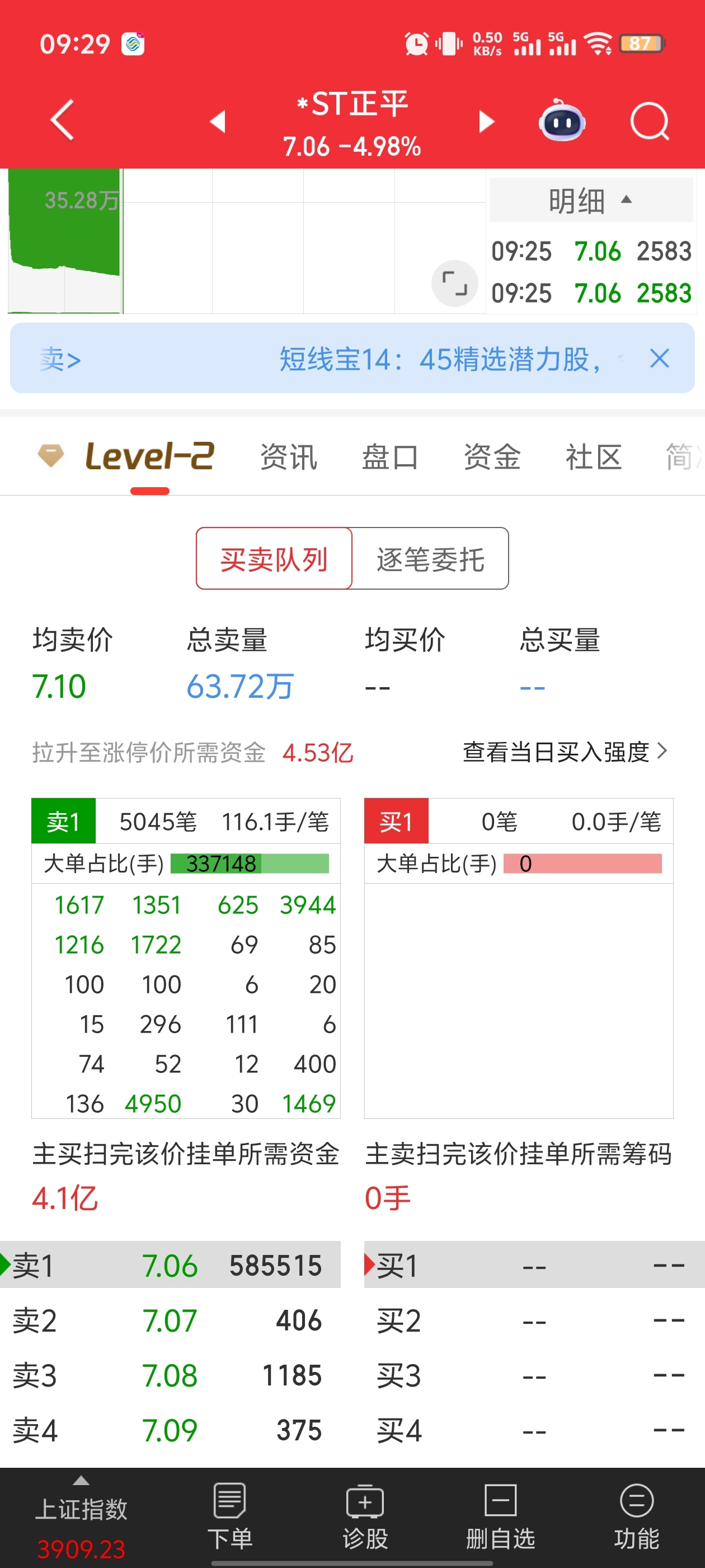 前面五个千手大单堵死了,还排吗,老师们?$*ST正平(SH603843)$