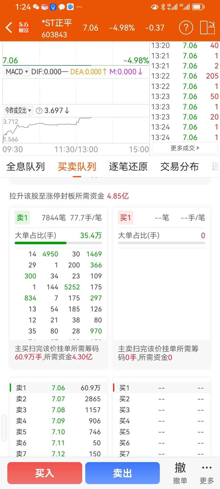 $*ST正平(SH603843)$ 大单35万手压盘