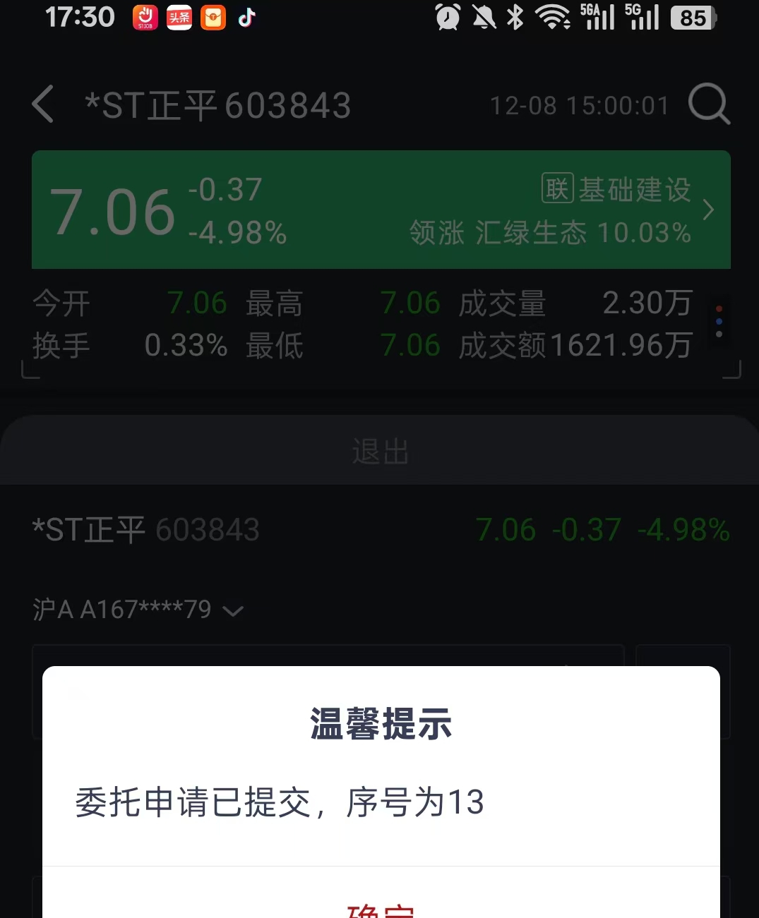 $*ST正平(SH603843)$ 看着秒表,卡点挂的单子。没想到还有手速比我我快的,明天应该能出去了吧。