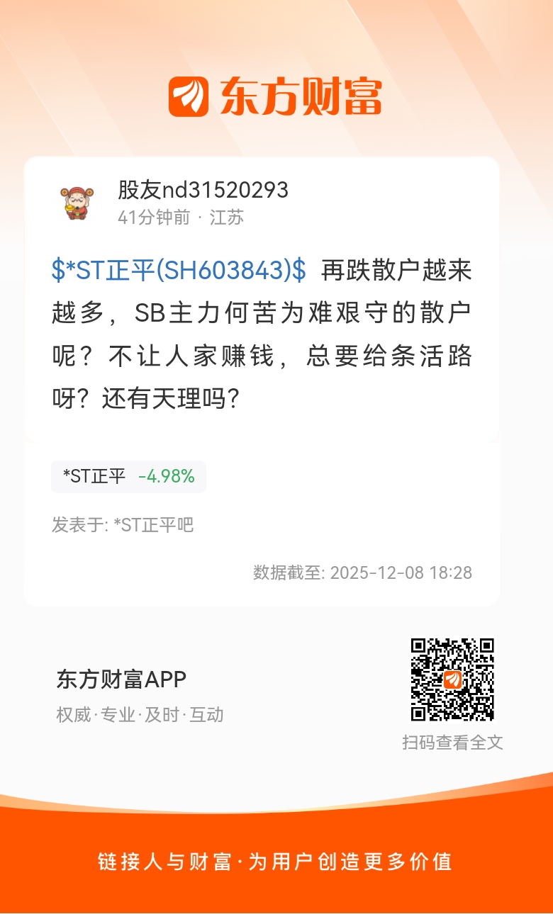 $*ST正平(SH603843)$  再跌散户越来越多,SB主力何苦为难艰守的散户呢?不让人家赚钱,总要给条活路呀?还有天理吗?