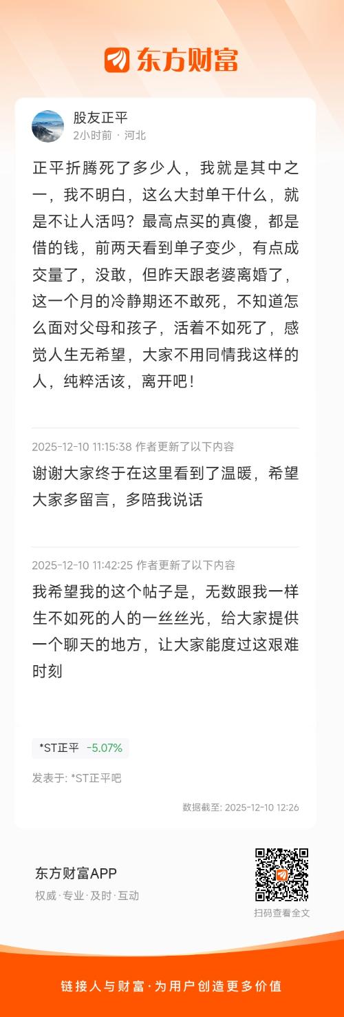 正平折腾死了多少人,我就是其中之一,我不明白,这么大封单干什么,就是不让人活吗?最高点买的真傻,都是借的钱,前两天看到单子变少,有点成交量了,没敢,但昨天跟老婆离婚了,这一个月的冷静期还不敢死,不知道怎么面对父母和孩子,活着不如死了,感觉人生无希望,大家不用同情我这样的人,纯粹活该,离开吧!