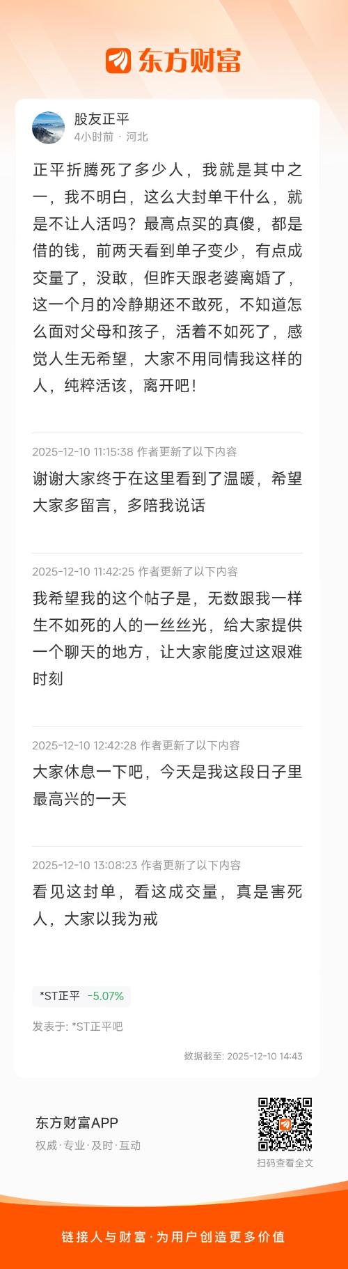 正平折腾死了多少人,我就是其中之一,我不明白,这么大封单干什么,就是不让人活吗?最高点买的真傻,都是借的钱,前两天看到单子变少,有点成交量了,没敢,但昨天跟老婆离婚了,这一个月的冷静期还不敢死,不知道怎么面对父母和孩子,活着不如死了,感觉人生无希望,大家不用同情我这样的人,纯粹活该,离开吧!