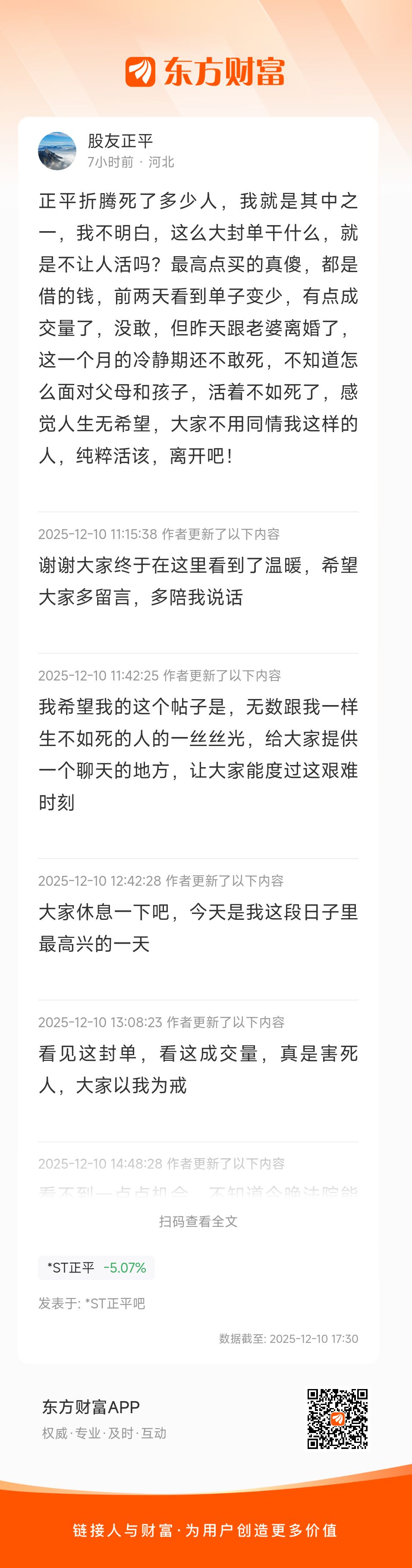 正平折腾死了多少人,我就是其中之一,我不明白,这么大封单干什么,就是不让人活吗?最高点买的真傻,都是借的钱,前两天看到单子变少,有点成交量了,没敢,但昨天跟老婆离婚了,这一个月的冷静期还不敢死,不知道怎么面对父母和孩子,活着不如死了,感觉人生无希望,大家不用同情我这样的人,纯粹活该,离开吧!