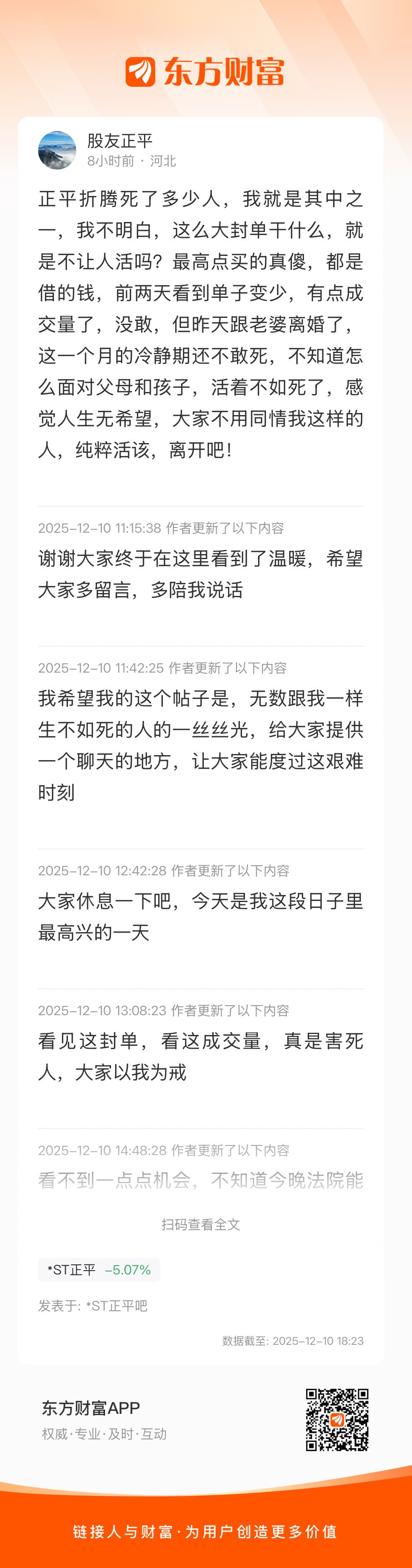 正平折腾死了多少人,我就是其中之一,我不明白,这么大封单干什么,就是不让人活吗?最高点买的真傻,都是借的钱,前两天看到单子变少,有点成交量了,没敢,但昨天跟老婆离婚了,这一个月的冷静期还不敢死,不知道怎么面对父母和孩子,活着不如死了,感觉人生无希望,大家不用同情我这样的人,纯粹活该,离开吧!