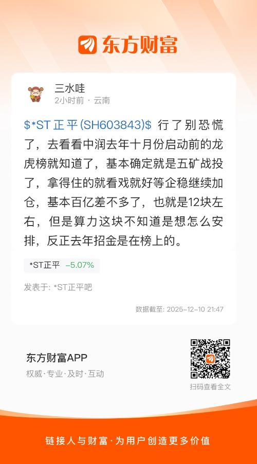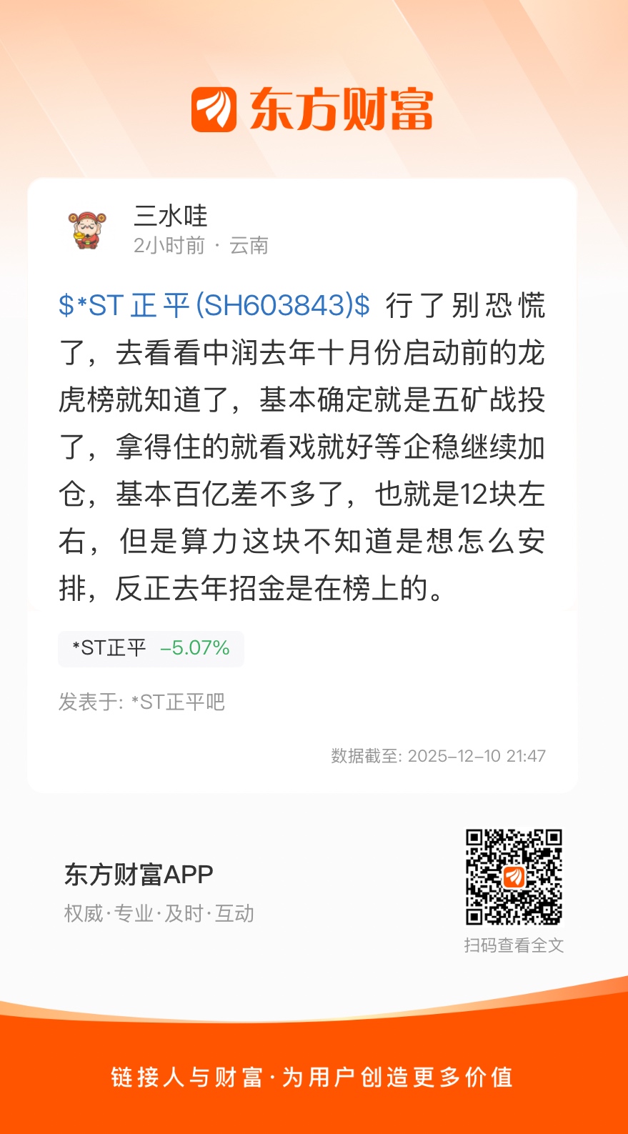 $*ST正平(SH603843)$ 行了别恐慌了,去看看中润去年十月份启动前的龙虎榜就知道了,基本确定就是五矿战投了,拿得住的就看戏就好等企稳继续加仓,基本百亿差不多了,也就是12块左右,但是算力这块不知道是想怎么安排,反正去年招金是在榜上的。