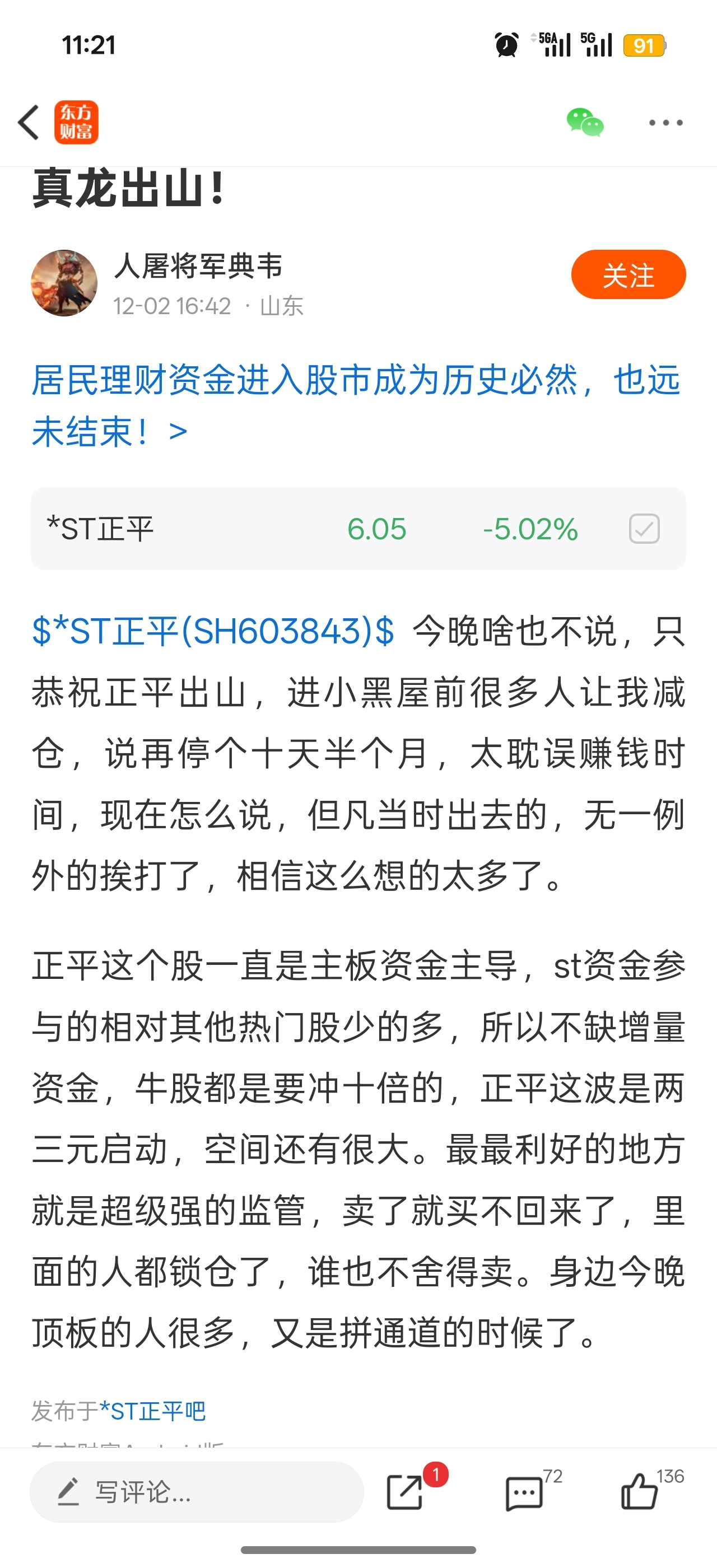 $*ST正平(SH603843)$ 速速去请人屠韦将军