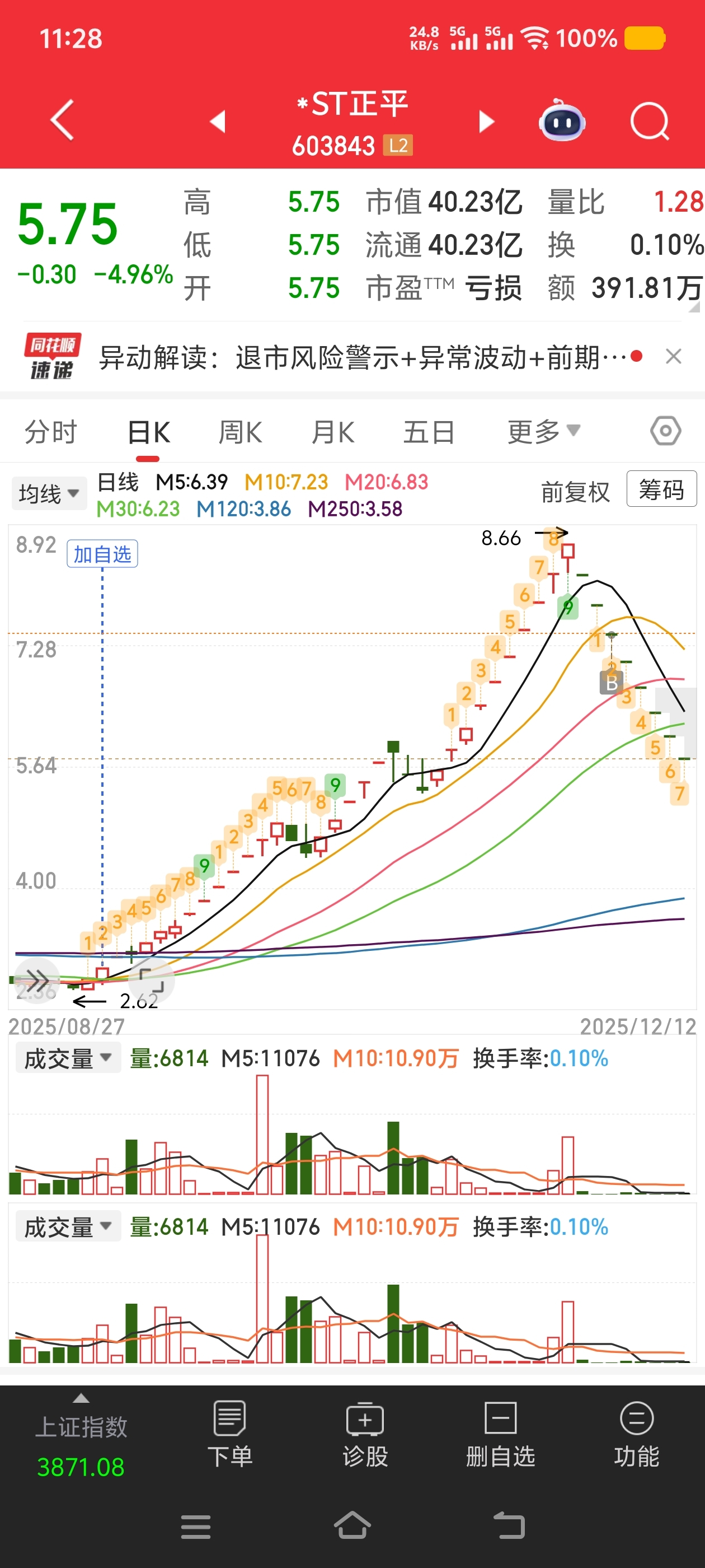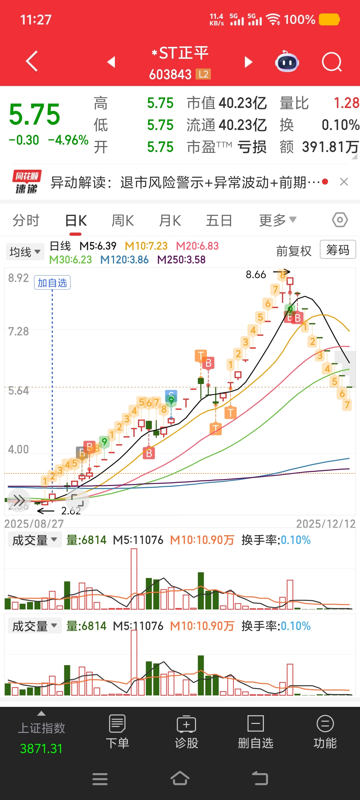 $*ST正平(SH603843)$ 我两个账户复牌之后加了两次仓,还是没主力恶心呀,不是不想买,真的没钱加仓了